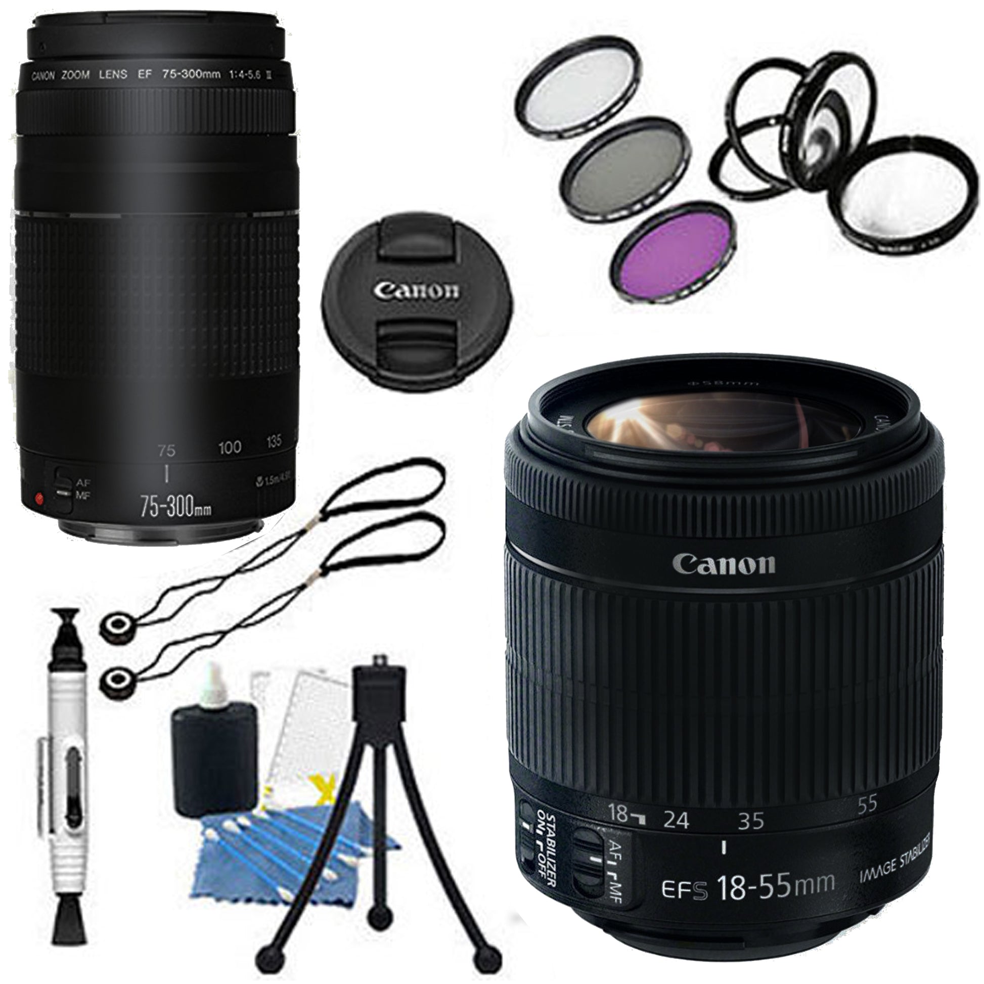 Canon EF-S 18-55mm f/3.5-5.6 IS STM Lens The EF-S 18-55mm f/3.5-5.6 IS STM Lens is a standard zoom compatible with Canon APS-C format cameras. It features a focal length range of 18-55mm which is equivalent to 29-88mm in the 35mm format. Optical Image Stabilization provides the equivalent of up to four stops of shake correction for clear imaging, even in low light. A high-precision aspherical element reduces chromatic aberration throughout the zoom range for high resolution and contrast. The lens supports Canon's EOS Movie Servo AF feature for smooth and quiet continuous autofocusing during movie recording. This feature is enabled by the use of a six-group zoom system plus a stepping motor focusing mechanism. Additionally, manual focus adjustment is possible while shooting in AF mode, and an internal focusing system enables faster performance, maintains an overall compact lens form-factor and allows for a closer minimum focusing distance of 9.8". The front element of the lens does not rotate during focusing, allowing you to use polarizing filters without a problem. Optimized lens coatings ensure precise color balance while minimizing ghosting and flare, and the 7-blade circular diaphragm produces pleasing background blur. Optical Image Stabilization provides up to 4 stops of correction against camera shake, providing you with clearer images, even in dim light. The STM feature complements the Movie Servo AF feature found on select EOS Cameras with a compact six-group zoom system and a new stepping motor and focus mechanism to deliver smooth and quiet continuous AF during movie shooting. Manual focus override allows you to utilize the manual focus option at any time, even in autofocus mode, for precise focusing when needed. One aspherical lens element reduces aberrations and helps to provide overall edge to edge sharpness. Canon EF 75-300mm f/4-5.6 III Lens The EF 75-300mm f/4-5.6 III Lens is a telephoto zoom lens ideal for day-to-day use because it is particularly light and compact, especially given its long focal reach. Able to magnify distant subjects, it also compresses the space between subjects within the frame and with a shallow depth of field at its longer lengths, it offers attractive out of focus bokeh. Its minimum focus distance is 4.9', even at the telephoto end of its zoom. 58mm 4pc Macro Kit The digital macro filter kit includes four close-up diopters of +1, +2, +4 and +10 magnification with a 58mm thread for easy screw-on attachment, effectively transforming your lens into a crisp macro lens. You can combine diopters to multiply magnification effect and add other filters for additional effects. 3PC Filter Kit 58mm These filters are manufactured from high quality solid optics. Each individual filter is heat treated and coated to avoid any rare movement or distortion. UV Protective Filter removes or absorbs ultra violet rays, giving sharper contrast to your film or video. Protects your lens from scratches or fingerprints. CPL circular polarizer filter increases color sturations, darker blue skies, so white clouds stand out and eleminate reflections from non metallic surfaces like glass or water. Florescent filter allows for using your camera under florescent lighting giving you natural light colors when shooting under florecent conditions. Lens Pen Safe for all LCD screens, lenses or other optical surfaces. Patented Dry Fiber Compound. Unique self-replenishing tip. Best for LCD screens. 2 Piece Cap Keeper-Lens Cap Holder 5 Piece Lens Cleaning Kit