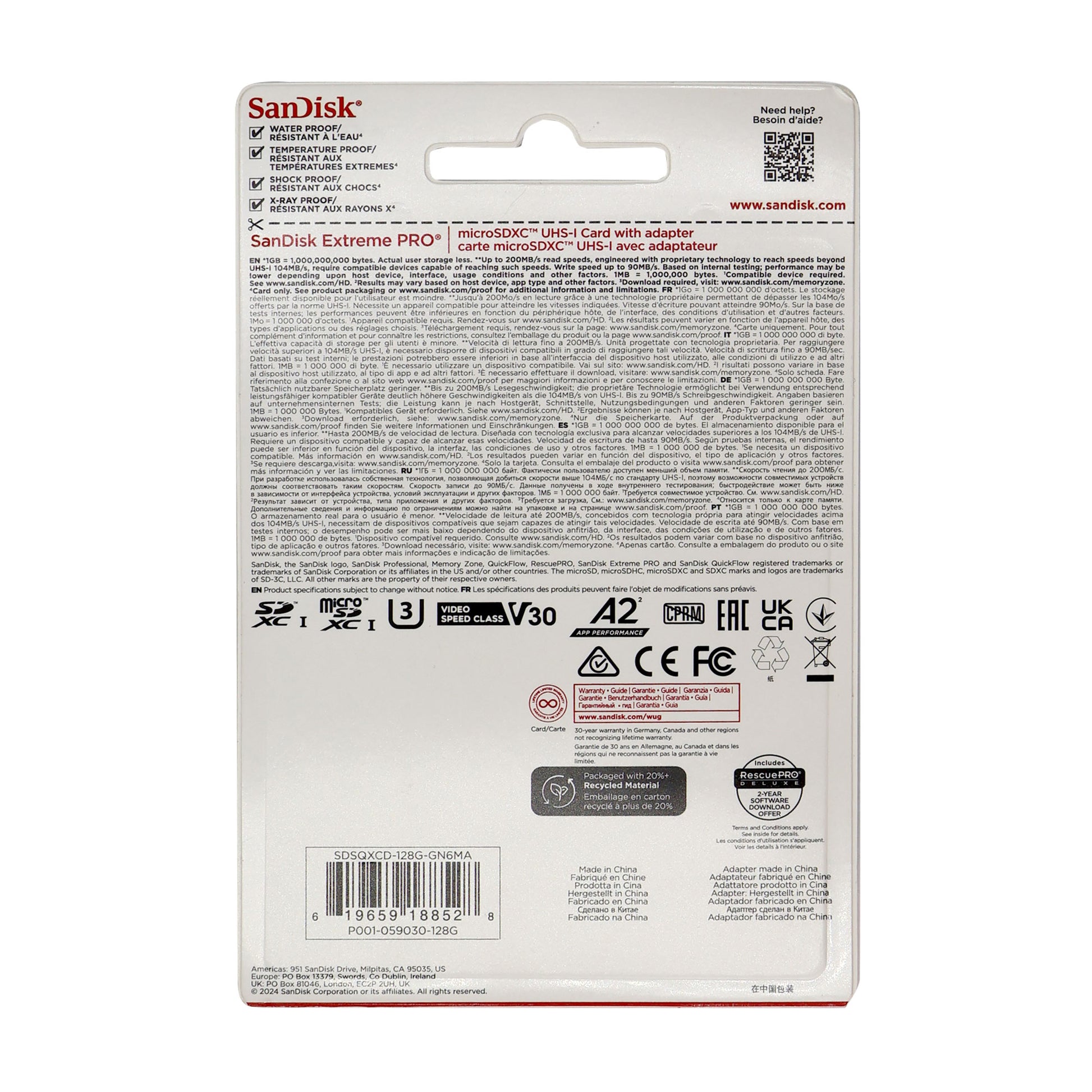 Take your storage performance to the next level with the SanDisk Extreme PRO microSDXC 128GB Memory Card (SDSQXCD-128G-GN6MA), complete with an SD card adapter for added versatility. Designed for professionals and power users, this high-performance card delivers blazing-fast read speeds of up to 200MB/s and write speeds up to 90MB/s, making it perfect for 4K UHD video, high-resolution photos, and demanding apps. Built to meet the A2 performance class, it ensures faster app loading and smooth performance on Android smartphones and tablets. With Class 10, UHS Speed Class 3 (U3), and Video Speed Class 30 (V30) ratings, you can confidently record and transfer ultra-high-definition content without lag or buffering. Whether you're a content creator, mobile gamer, or on-the-go photographer, the SanDisk Extreme PRO is engineered for durability in harsh conditions—waterproof, shockproof, temperature-proof, and X-ray-proof—giving you the reliability you need wherever you go. Key Features: 128GB capacity for ample storage Up to 200MB/s read & 90MB/s write speeds A2-rated for high-speed app performance V30 & U3 rated for smooth 4K UHD video Includes SD adapter for wider compatibility Capture, transfer, and store without limits—choose SanDisk Extreme PRO for uncompromised speed and reliability.