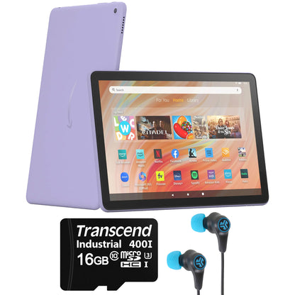 AMAZON FIRE HD 10 10.1" 32GB WI-FI TABLET, 13TH GENERATION, VIBRANT FULL HD SCREEN, LILAC + JLAB PLAY GAMING WIRELESS BLUETOOTH EARBUDS - BLACK/BLUE + TRANSCEND 16GB MICROSD MEMORY CARD