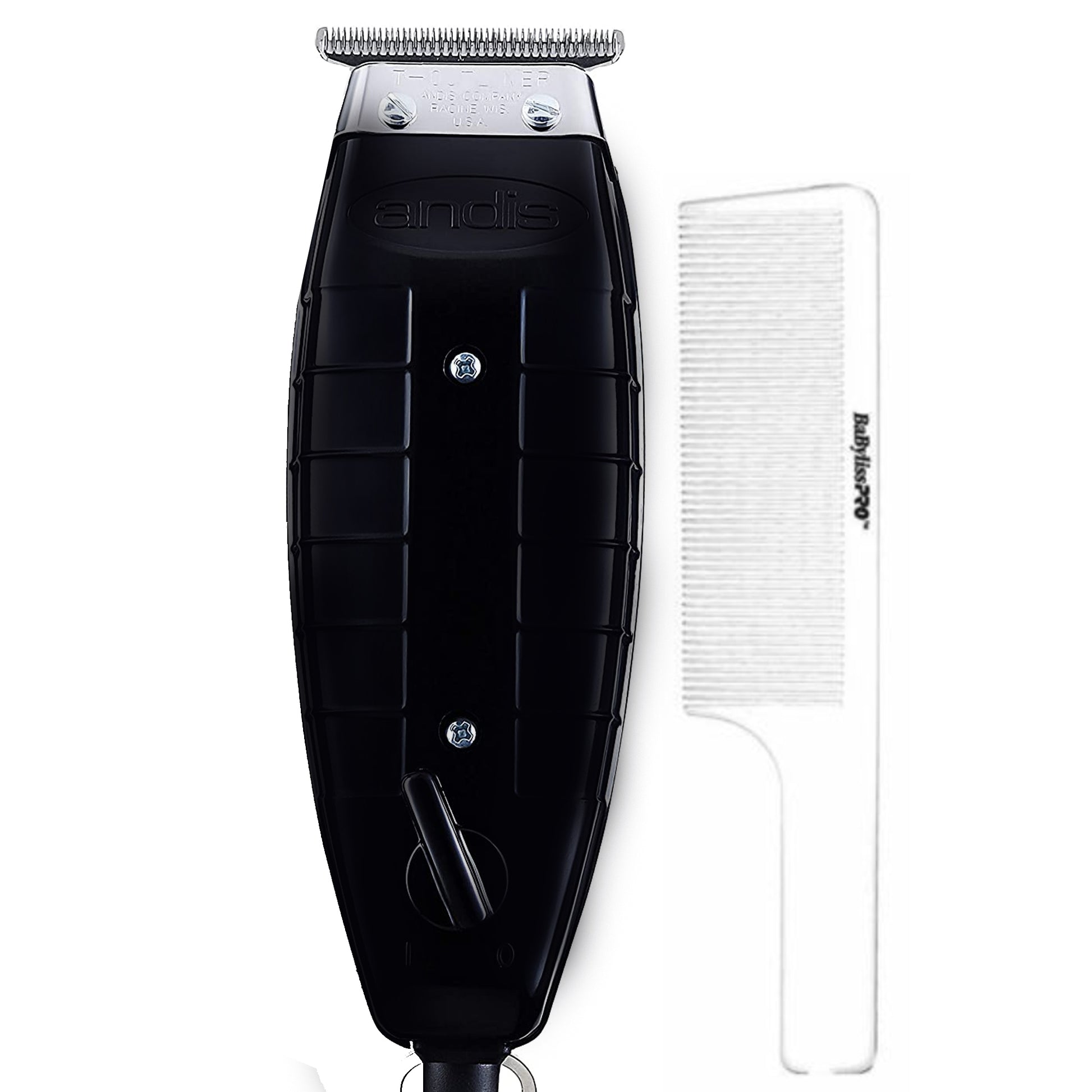 Get professional hair-cutting results with the Andis 04775 GTX T Outliner Corded Trimmer. Carbon steel blades cut smoothly for fine detail while the magnetic motor runs quietly. Use along with the four included guide combs for creating outlines and fades as well as dry shaving. An 8' cord offers a long reach while a hanger loop provides a convenient storage option. This corded hair trimmer also has a contoured shape for a more comfortable grip. Andis 4775 GTX T-Outliner Trimmer, Black.