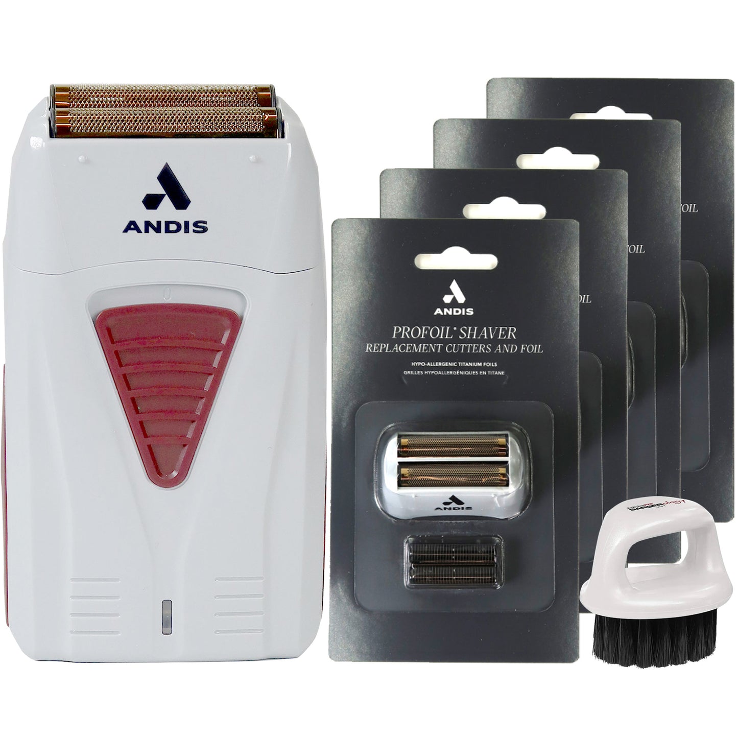 ANDIS PROFOIL LITHIUM TITANIUM FOIL SHAVER #17235 + 4X ANDIS PROFOIL SHAVER REPLACEMENT CUTTERS AND FOIL #17280 + BABYLISS PRO SOFT KNUCKLE NECK BRUSH