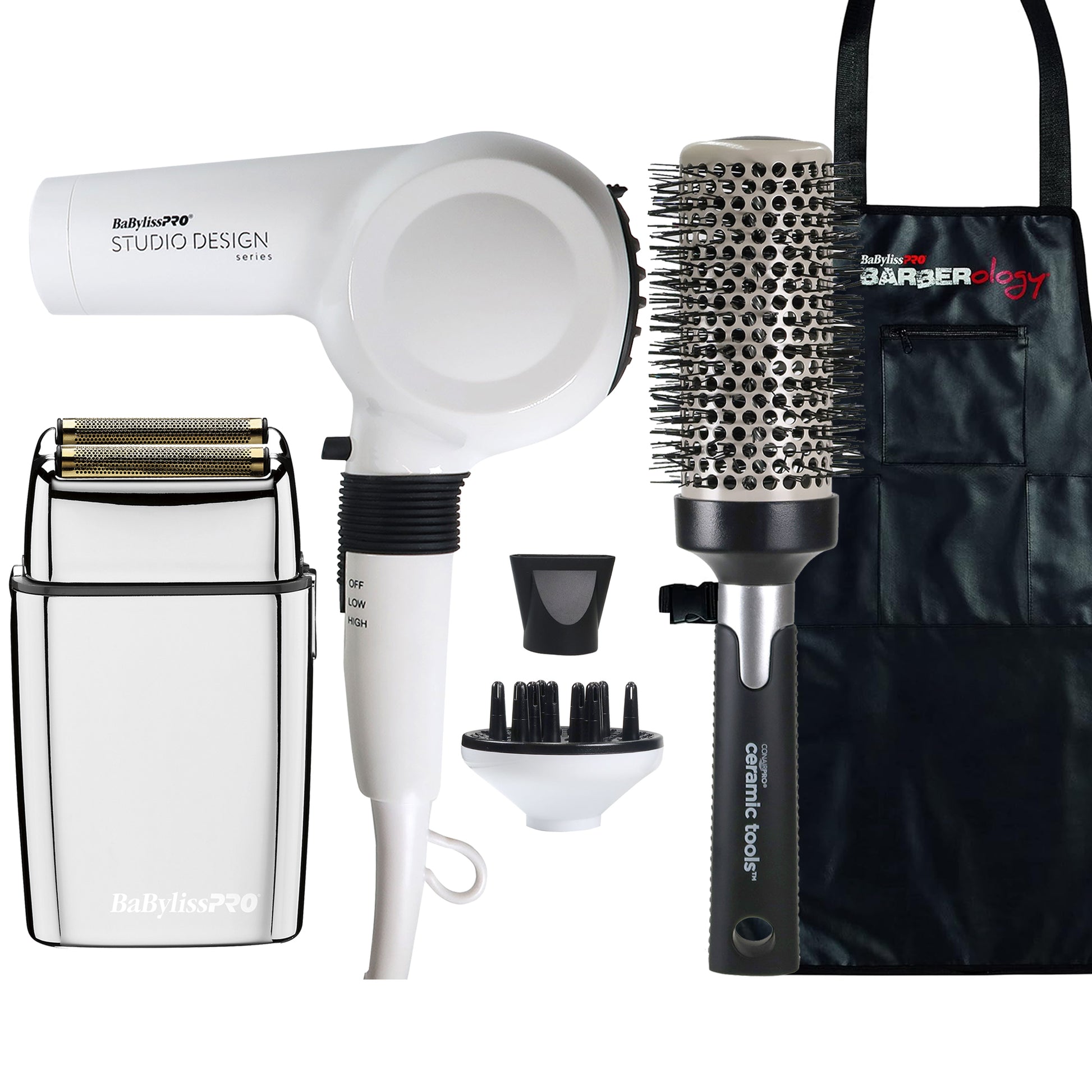 BABYLISS PRO THE COMPACT MIDI DRYER #BCI250UC + BABYLISS PRO FOILFX02 CORDLESS METAL SILVER DOUBLE FOIL SHAVER FXFS2S-SILVER + CONAIR PRO CERAMIC TOOLS LARGE ROUND BRUSH 2½" (#CPBCTR25) + BABYLISS PRO BARBEROLOGY INDUSTRIAL BARBER APRON