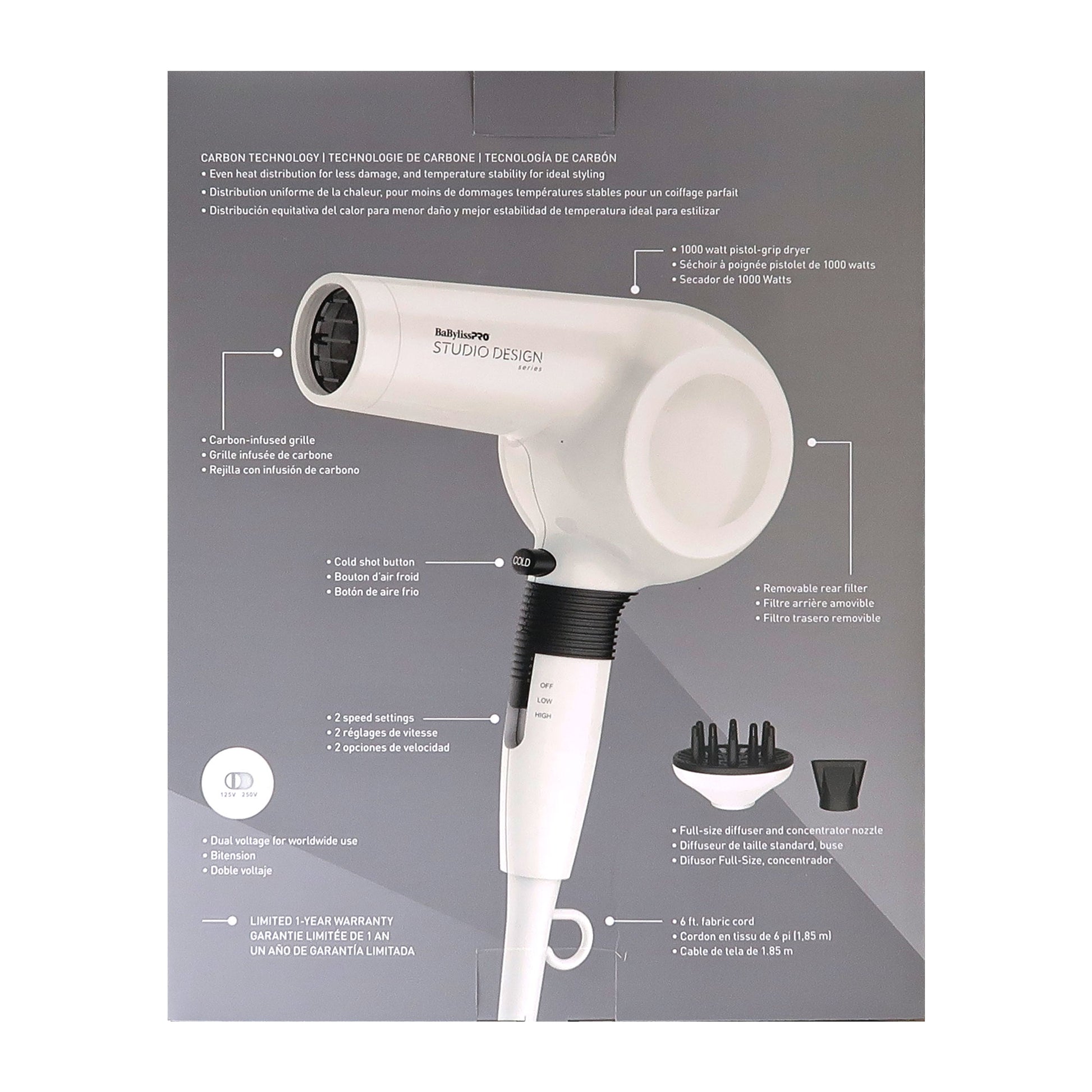 The Studio Design Series Midi Dryer is the perfect compact size without sacrificing power, dual voltage for travel and features 1000 watts with carbon technology plus a full-size diffuser and concentrator for ideal styling.