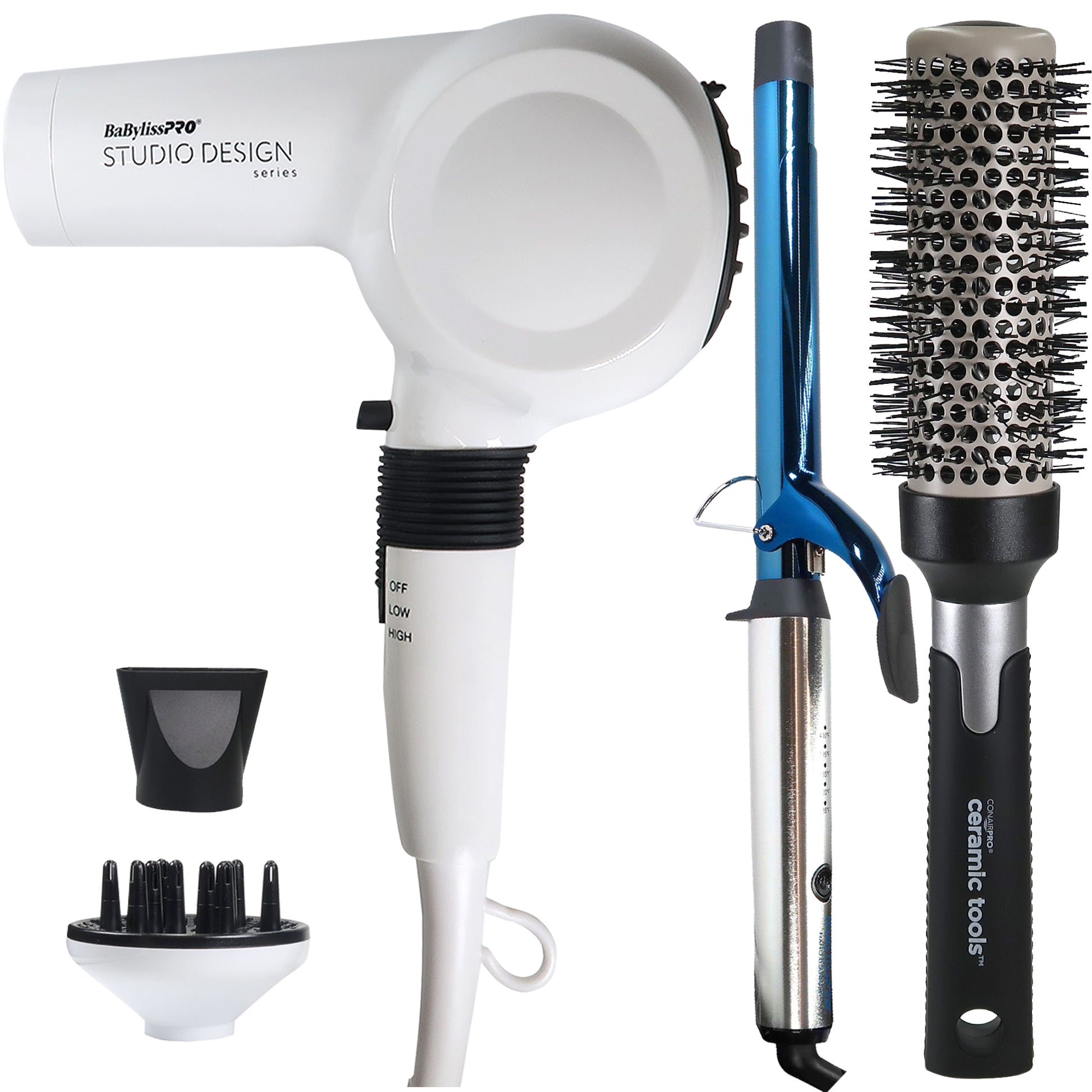 BABYLISS PRO NANO TITANIUM 1" COMPACT FULL POWER CURLING WAND WITH 3 HEAT SETTINGS #BNTMWUC + BABYLISS PRO THE COMPACT MIDI DRYER #BCI250UC + CONAIRPRO CERAMIC TOOLS MEDIUM ROUND BRUSH 2" (#CPBCTR2)