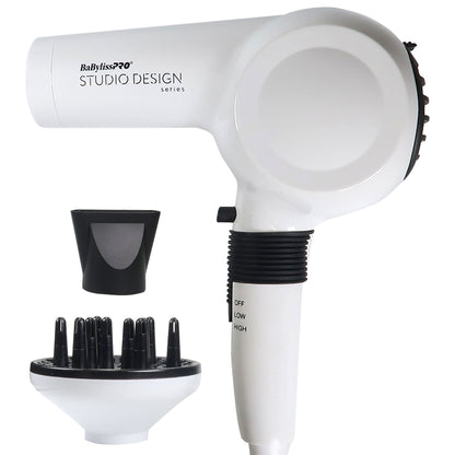 The Babyliss Pro Studio Design Series Midi Dryer is the perfect compact size without sacrificing power, dual voltage for travel and features 1000 watts with carbon technology plus a full-size diffuser and concentrator for ideal styling.