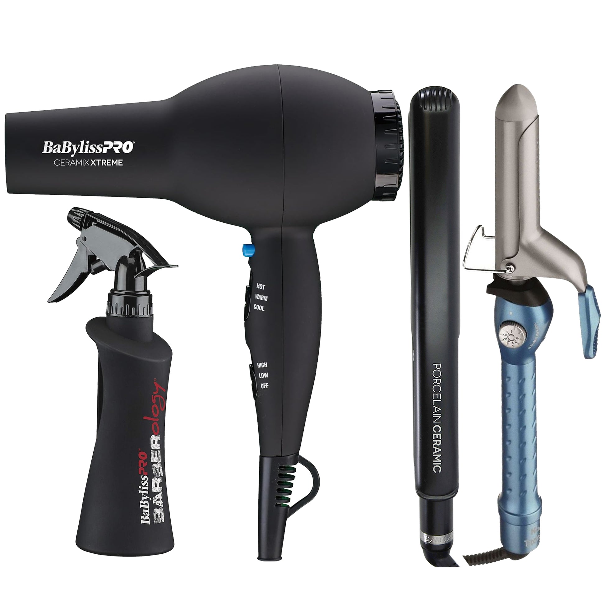 BABYLISS PRO CERAMIC XTREME HAIR DRYER + BABYLISS PRO PORCELAIN CERAMIC STRAIGHTENING IRON - 1" #BABP9557UC + BABYLISS PRO NANO TITANIUM 1 1/4" SPRING CURLING IRON ITEM NO. BNT125S + BABYLISS PRO BSPRAYBOT BARBEROLOGY 10OZ SPRAY BOTTLE