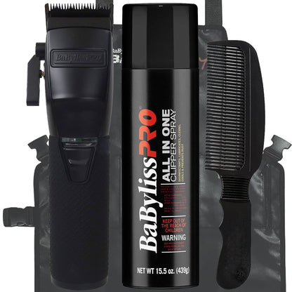 BABYLISS PRO BOOST+ CLIPPER #FX870BP-MB MATTE BLACK + BABYLISS PRO FXDS15 ALL IN ONE CLIPPER SPRAY + WAHL FLAT TOP COMB + INDUSTRIAL BARBER APRON
