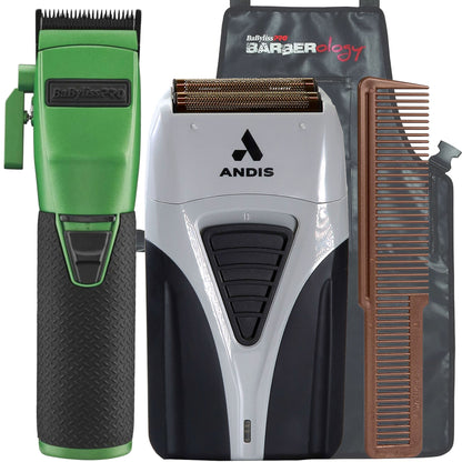 BABYLISS PRO FX870GI BOOST+ INFLUENCER COLLECTION CORDLESS CLIPPER GREEN + ANDIS PROFOIL PROFESSIONAL SHAVER PLUS 17255 + LARGE STYLING COMB 3191-2501 + INDUSTRIAL LARGE BARBER APRON