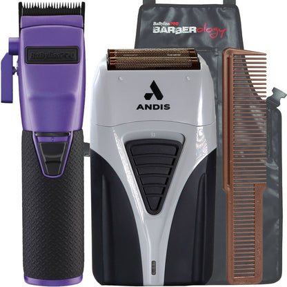 BABYLISS PRO FX870PI BOOST+ INFLUENCER COLLECTION CORDLESS CLIPPER PURPLE + ANDIS PROFOIL PROFESSIONAL SHAVER PLUS 17255 + LARGE STYLING COMB 3191-2501 + INDUSTRIAL LARGE BARBER APRON