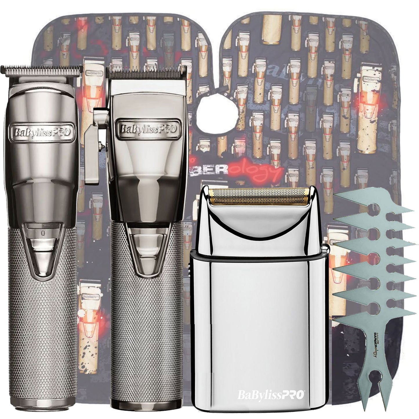 BABYLISS PRO FX788S FX METAL LITHIUM CORDLESS TRIMMER SILVER + BABYLISS PRO FX870S CORDLESS CLIPPER SILVER + BABLYISS PRO FOILFX01 CORDLESS METAL SINGLE FOIL + BABYLISS PRO BARBEROLOGY WIDE TOOTH STYLING COMB + BABYLISS PRO BARBEROLOGY GOLDFX CAPE