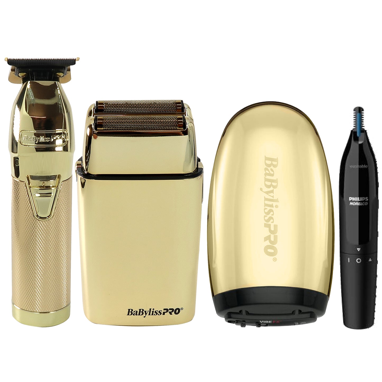 BABYLISS PRO LIMITEDFX COLLECTION TRIMMER AND DOUBLE FOIL SHAVER GOLD #FXDUOFS2TG + BABYLISS PRO VIBE FX CORD / CORDLESS MASSAGER FXSSMG GOLD + PHILIPS NORELCO ULTIMATE COMFORT NOSE TRIMMER 1000 BATTERY POWERED NT1605/60 FOR NOSE, EAR AND EYEBROWS
