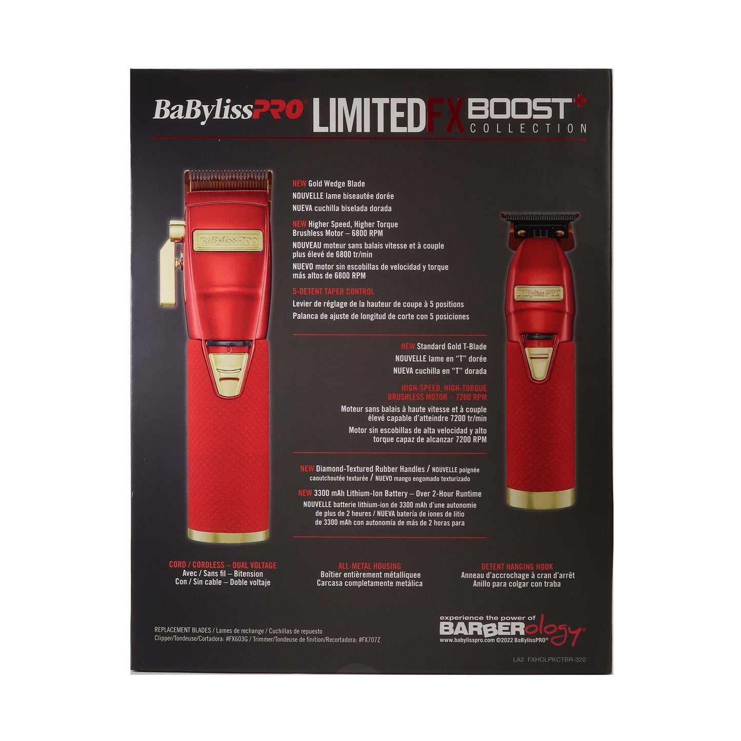 Limited Edition Gift Set. This Gift Set includes our Boost+ Clipper, Boost+ Trimmer andCharging Bases in a LIMITED Red color. Our NEW Boost+ Collection items feature a new higher speed, higher torque brushless motor, increased run time, and diamond-textured rubber handles.
