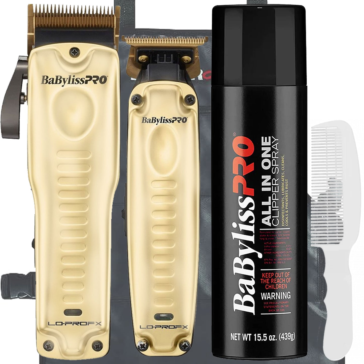 BABYLISS PRO LIMITED-EDITION LO-PROFX CLIPPER AND TRIMMER GIFT SET GOLD #FXHOLP-G + BABYLISS PRO FXDS15 AALL IN ONE CLIPPER SPRAY + BABYLISS PRO BARBEROLOGY INDUSTRIAL BARBER APRON + WAHL FLAT TOP COMB 3329-100