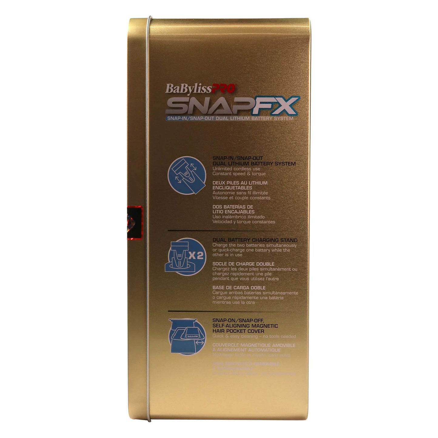 Introducing the new BaBylissPRO SNAPFX. For the first time ever, the power of UNLIMITED cordless runtime is in your hands with our patent-pending, industry-first dual battery system. Effortlessly snap in/snap out the high-capacity battery cartridges while you work. Charge one cartridge while using the other, enabling you to cut for as long as you want, client after client. The new BaBylissPRO SNAPFX: The revolutionary power system that keeps going as long as you do.