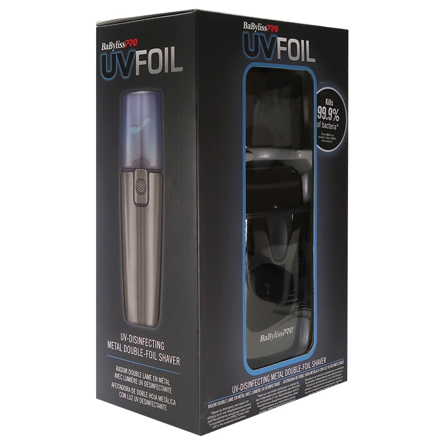 This BaByliss Pro UVFOIL UV-Disinfecting Cordless Metal UV Double Foil Shaver has an auto shutoff UV light indicator that kills 99.9% of bacteria.