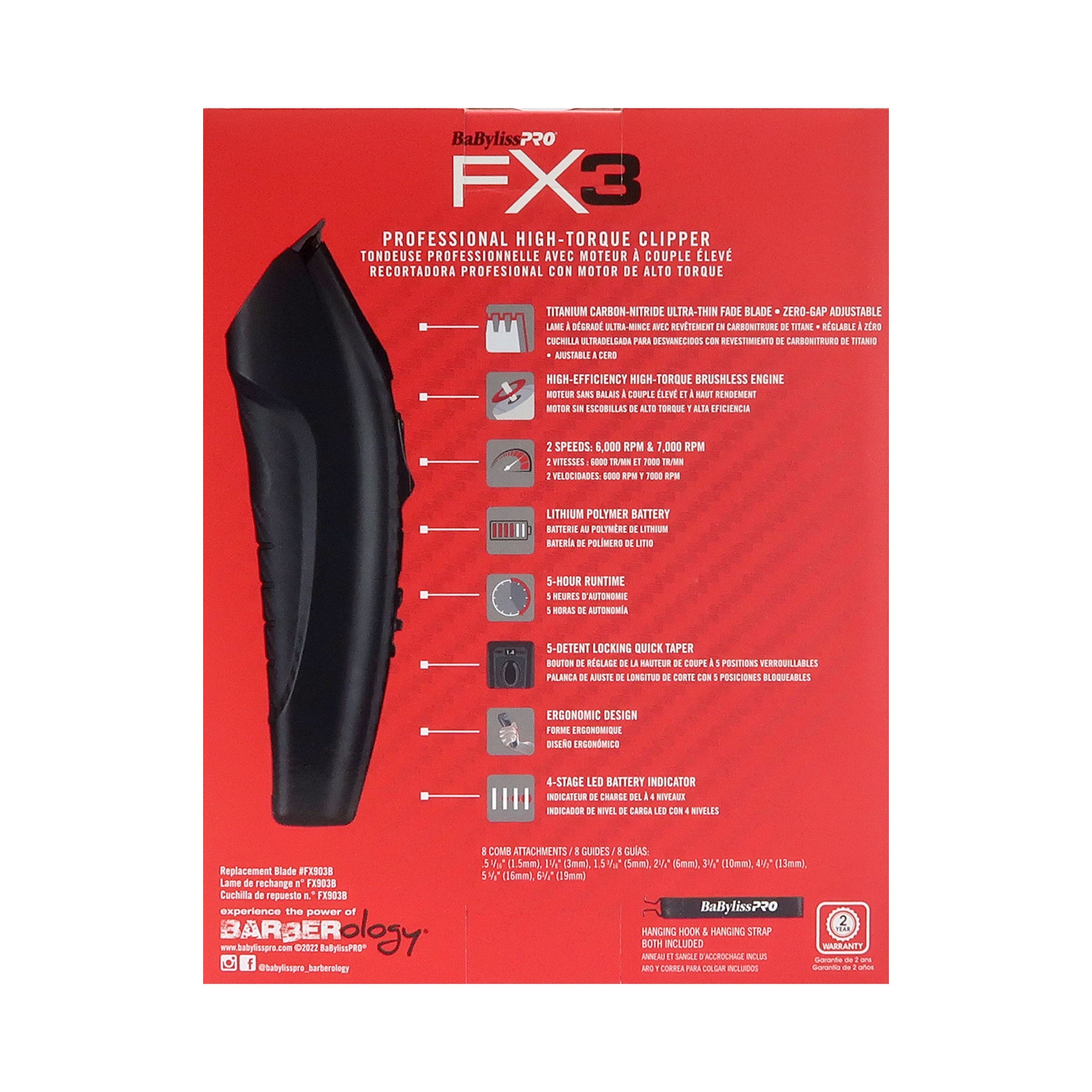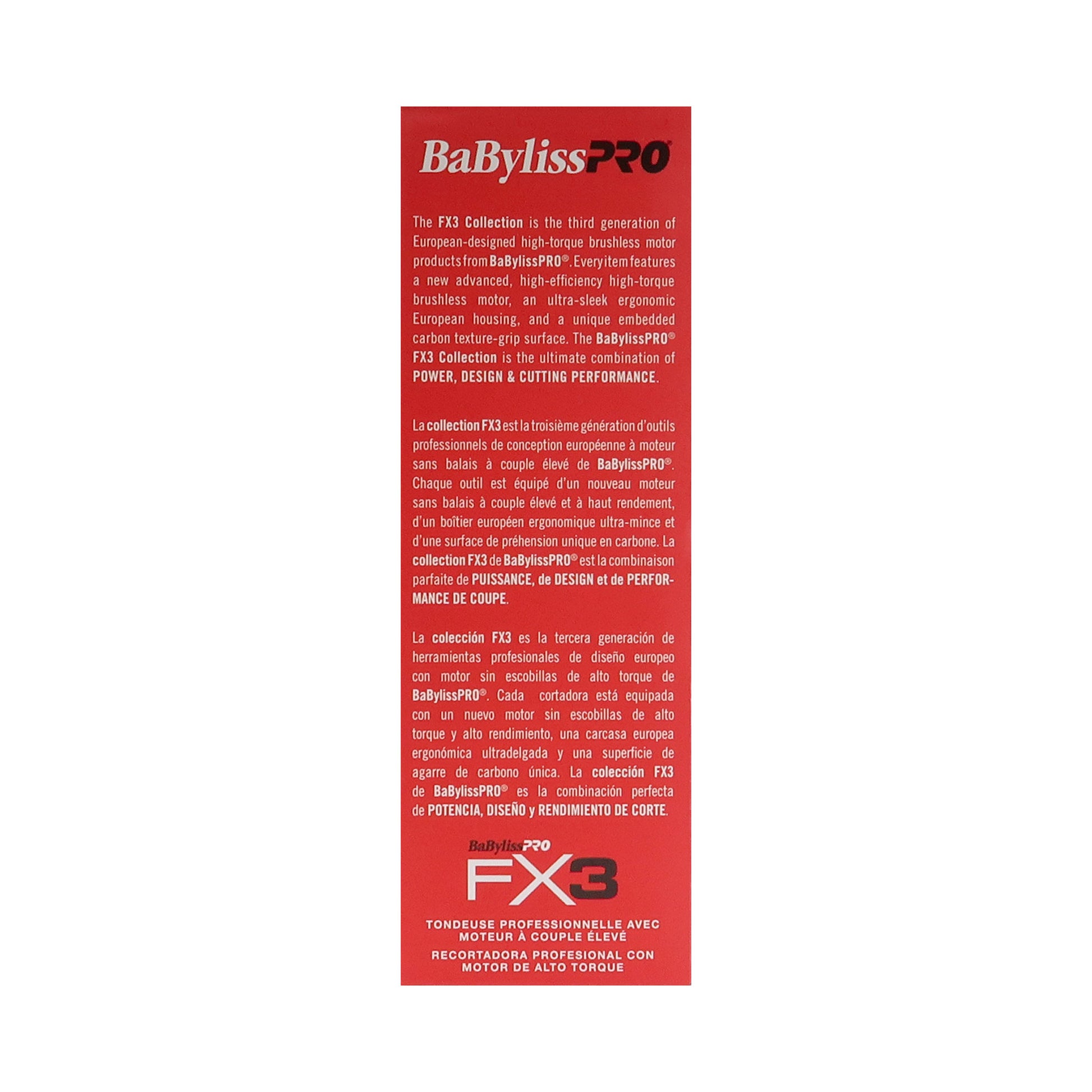 BABYLISS PRO FX3 BLACK HIGH TORQUE CORDLESS CLIPPER FXX3CB (BLACK) + BABYLISSPRO BARBEROLOGY 9 INCH CLIPPER COMB - REDBaByliss PRO FX3 Black High Torque Cordless ClipperThe FX3 Collection. Every item features advanced high-torque engines, ultra-sleek ergonomic European housings, and a unique embedded carbon texture grip surface. The BaByliss Pro FX3 Collection is the ultimate combination of POWER, DESIGN & CUTTING PERFORMANCE.