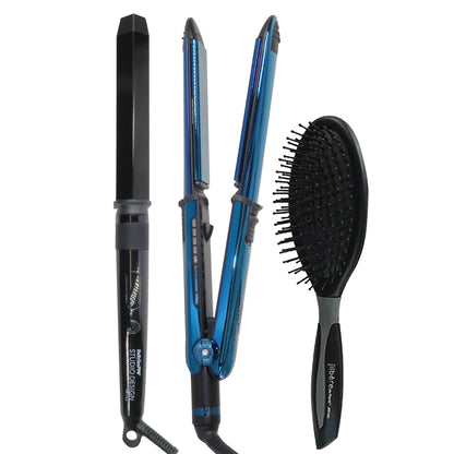 BABYLISS PRO LIMITED EDITION NANO TITANIUM PRIMA 3000 1¼" STAINLESS STEEL FLAT IRON BLACK & BLUE #BNTMB3000TUC (DUAL VOLTAGE) + BABYLISS PRO STUDIO DESIGN SERIES 1.25 INCH CRIMPCURL #BCI005UC + CONAIR PRO ERGO-GRIP DETANGLER BRUSH FOR ALL HAIR TYPES