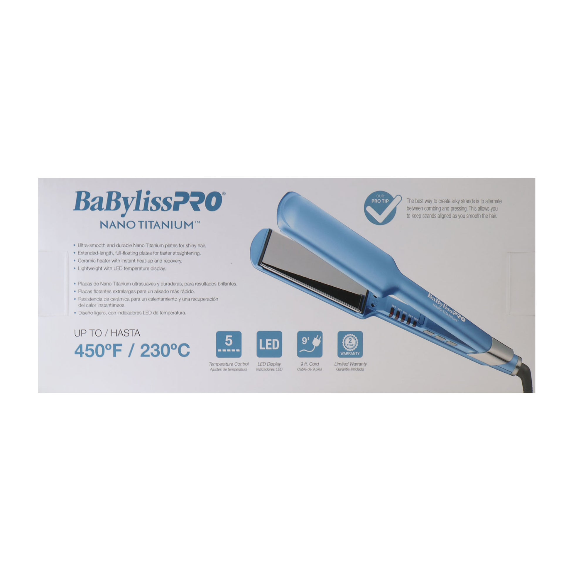 BABYLISS PRO NANO TITANIUM 2" ULTRA-SLEEK HAIR STRAIGHTENER, FLAT IRON + BABYLISS PRO NANO TITANIUM 1" ULTRA-SLEEK HAIR STRAIGHTENER, FLAT IRONNano Titanium Ultra-Sleek Hair Straightener, Flat Iron for All Hair TypesThe 2" Ultra-Sleek Hair Straightener has ultra smooth and durable titanium plates resulting in shiny hair. The extended-length and full-floating plates make for faster straightening. The ceramic heater has instant heat-up and recovery with temperatures ranging from 265 - 450 degrees. The LED temperature display makes it easy to know your temperature. The slim, ergonomic design allows for comfortable, stress-free styling