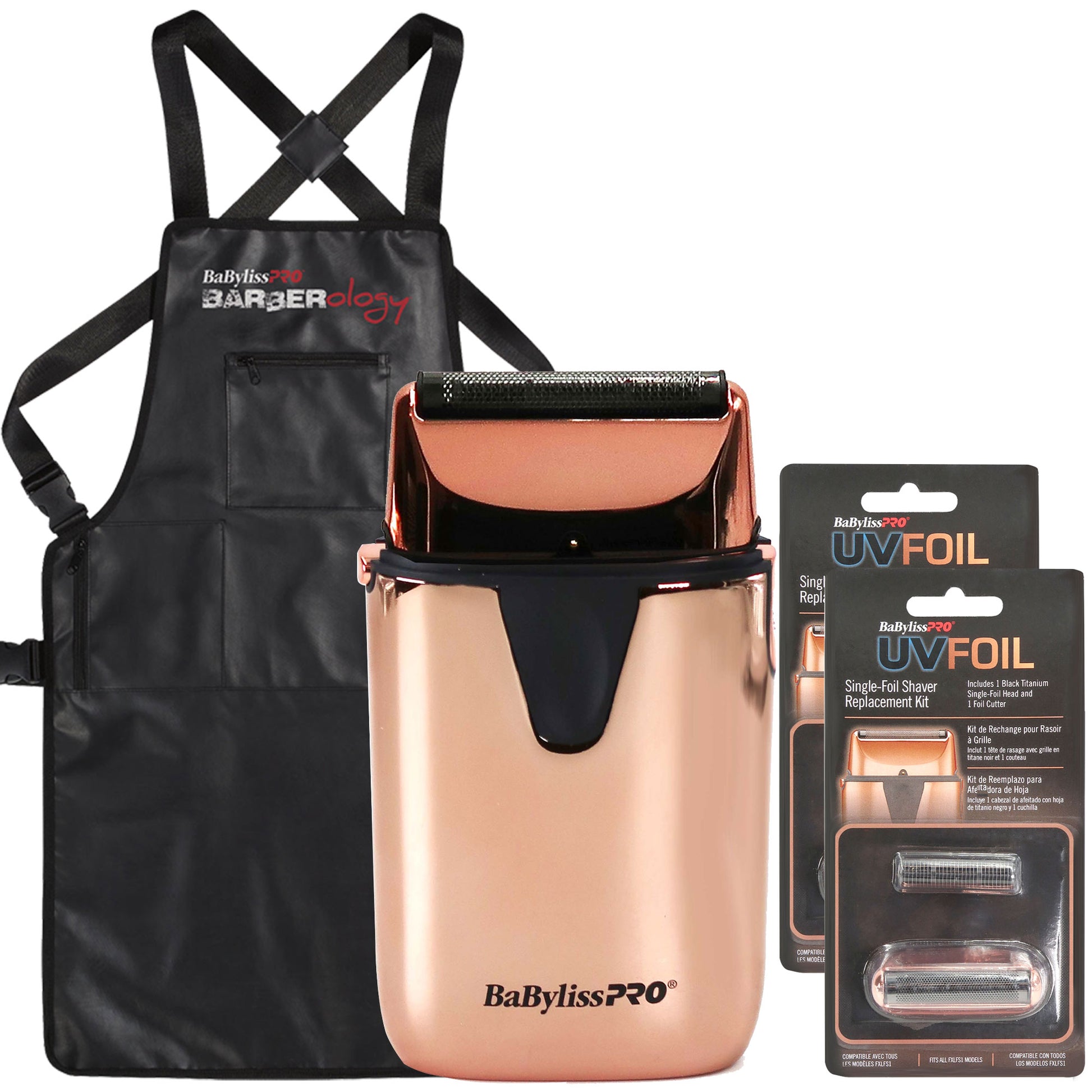 BABYLISS PRO LIMITED EDITION UVFOIL UV-DISINFECTING METAL SINGLE FOIL SHAVER - ROSE GOLD #FXLFS1RG + BABYLISS PRO UVFOIL SINGLE-FOIL SHAVER REPLACEMENT KIT [SINGLE-FOIL & CUTTERS] - ROSE GOLD #FXLRF1RG + BABYLISS PRO BARBEROLOGY INDUSTRIAL BARBER APRON