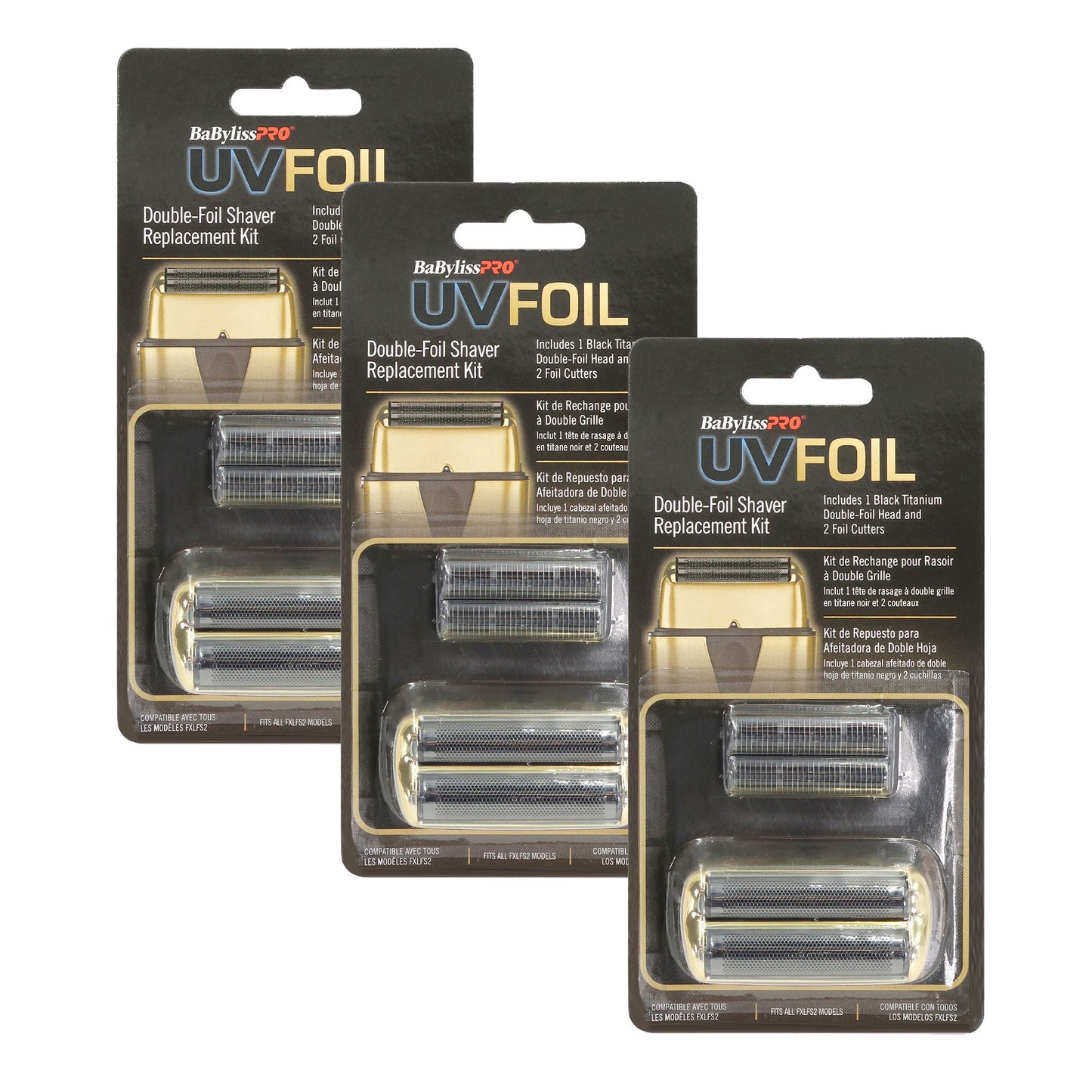 This Kit from Teds Electronics Includes:- 3x BaByliss Pro UVFOIL Double-Foil Shaver Replacement Kit [Double-Foil & 2 Cutters] - Gold #FXLRF2G
