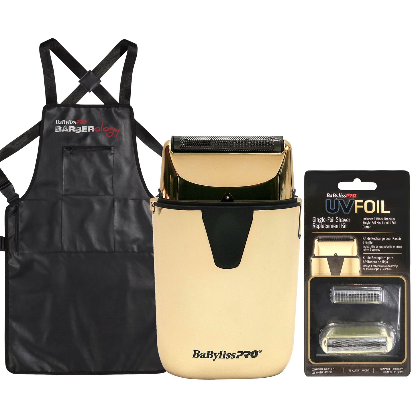 BABYLISS PRO UVFOIL UV-DISINFECTING METAL SINGLE FOIL SHAVER - GOLD #FXLFS1G + BABYLISS PRO UVFOIL SINGLE-FOIL SHAVER REPLACEMENT KIT [SINGLE-FOIL & CUTTERS] - GOLD #FXLRF1G + BABYLISS PRO BARBEROLOGY INDUSTRIAL BARBER APRON