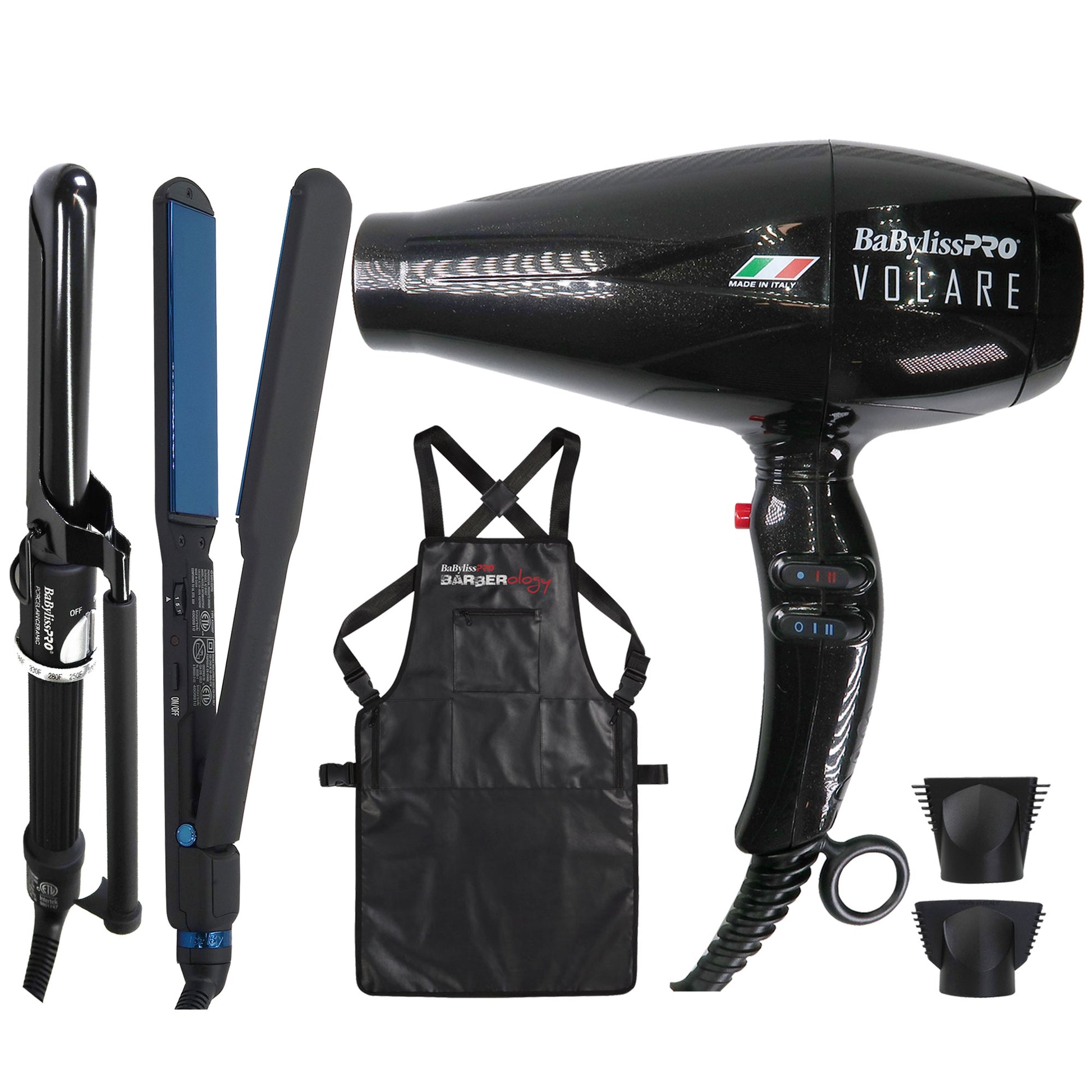 BABYLISS PRO VOLARE NANO TITANIUM PROFESSIONAL QUALITY ITALIAN PERFORMANCE HAIR DRYER 2000-WATT BLOW DRYER (BLACK) #BVOL1 + BABYLISS PRO LIMITED EDITON NANO TITANIUM 1-1/2" ULTRA-THIN FLAT IRON #BNTMB4073TUC+ BABYLISSPRO PORCELAIN CERAMIC MARCEL 1" CURLING IRON BP100MUC + INDUSTRIAL BARBEER APRON
