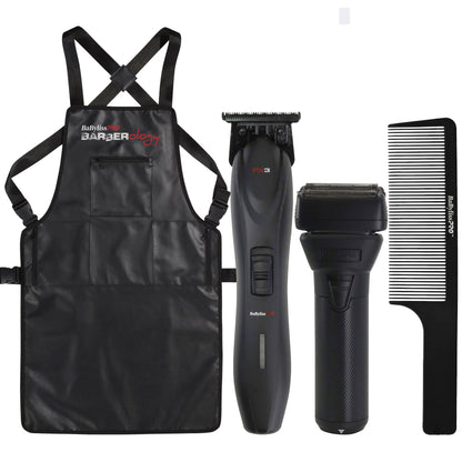 BABYLISS PRO FX3 PROFESSIONAL HIGH TORQUE TRIMMER - BLACK #FXX3TB + BABYLISS PRO FXONE BLACKFX ALL-METAL INTERCHANGEABLE-BATTERY SHAVER #FX79FSMB + BABYLISS PRO BARBEROLOGY 9" CLIPPER COMB - BLACK + BARBER APRON