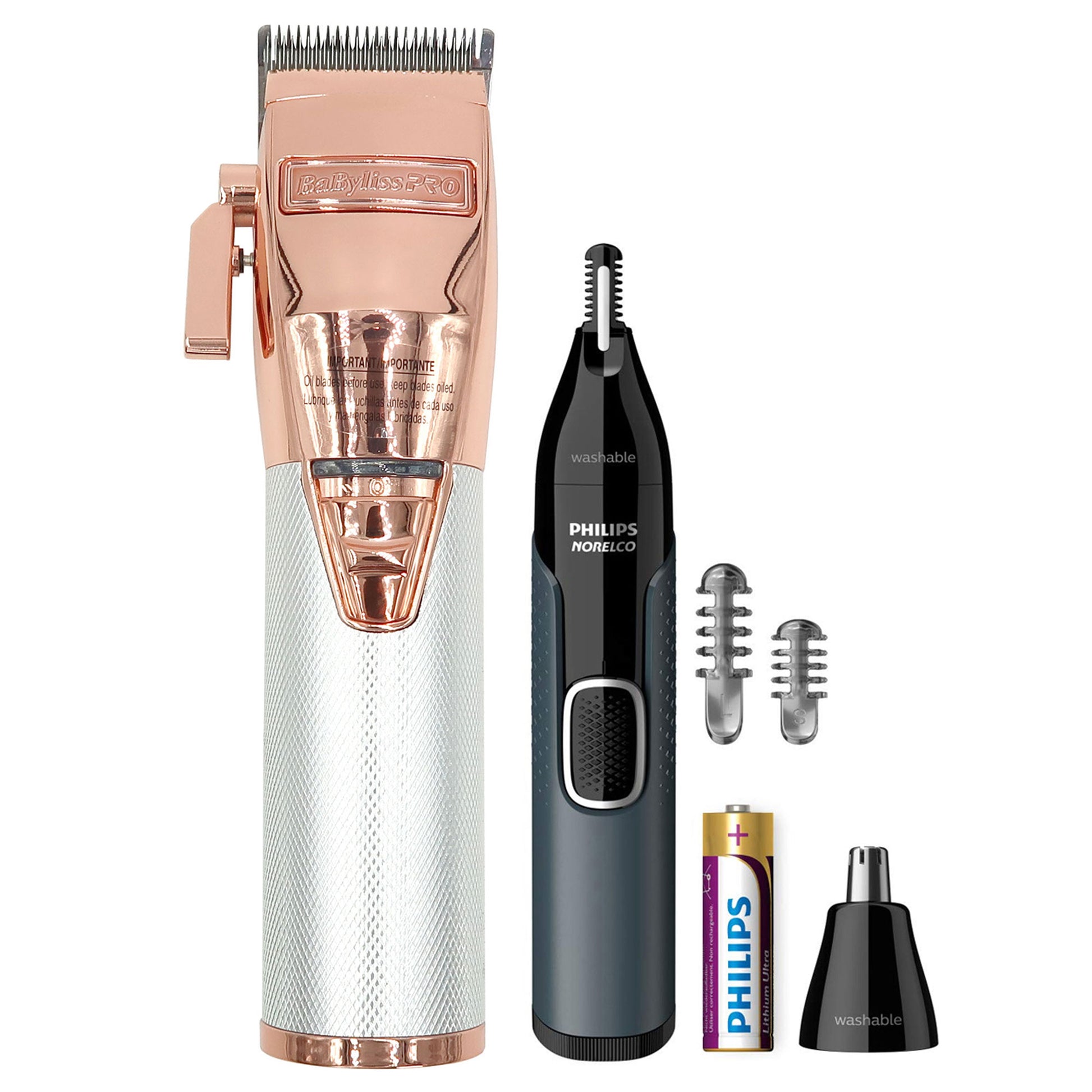 BABYLISS PRO ROSEFX+ ALL-METAL LITHIUM CLIPPER #FX870NRG + NORELCO NOSE TRIMMER 3000 FOR NOSE, EARS EYEBROWS #NT3600/62 (BLACK)