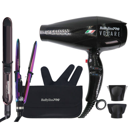 BABYLISS PRO VOLARE NANO TITANIUM PROFESSIONAL QUALITY ITALIAN PERFORMANCE HAIR DRYER 2000-WATT BLOW DRYER (BLACK) #BVOL1 + BABYLISS PRO LIMITED EDITION NANO TITANIUM PRIMA 3000 FLAT IRON MIDNIGHT PURPLE - 1¼" #BNTP3000TUC (DUAL VOLTAGE) + BABYLISS PRO NANO TITANIUM PRIMA2000 3/4" STAINLESS STEEL MINI FLAT / CURLING IRON IRIDESCENT #BNTBRB2000UC