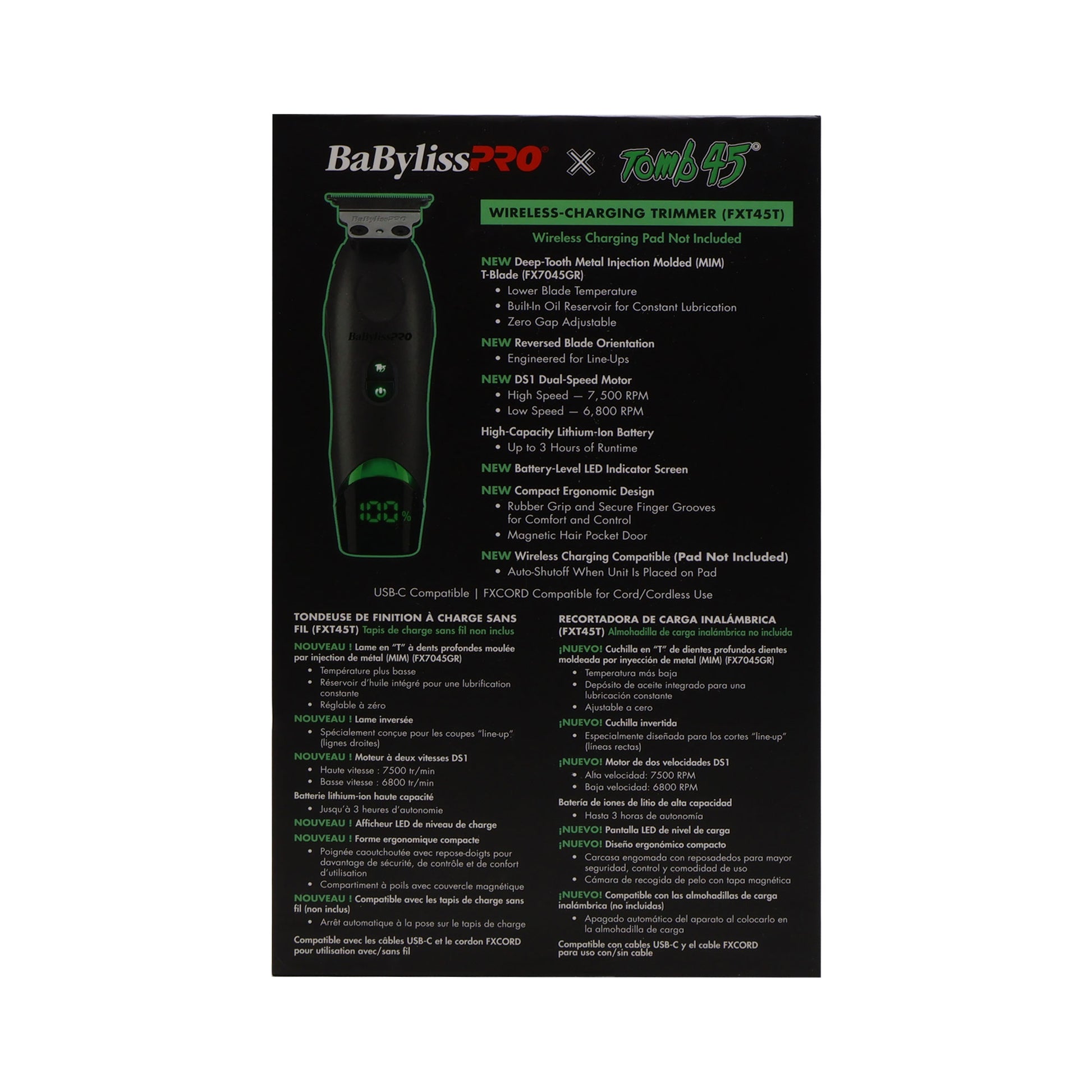 The BaBylissPRO x Tomb45 Trimmer is built for precision and power, designed by barbers, for barbers. It features a Deep-Tooth MIM T-Blade with lower blade temperature, a built-in oil reservoir, and zero-gap adjustability. Powered by the DS1 Dual-Speed Motor and a high-capacity lithium-ion battery, it delivers up to 3 hours of runtime. With a reversed blade orientation for crisp line-ups, wireless charging compatibility, and USB-C charging, it’s crafted for pro-level performance.