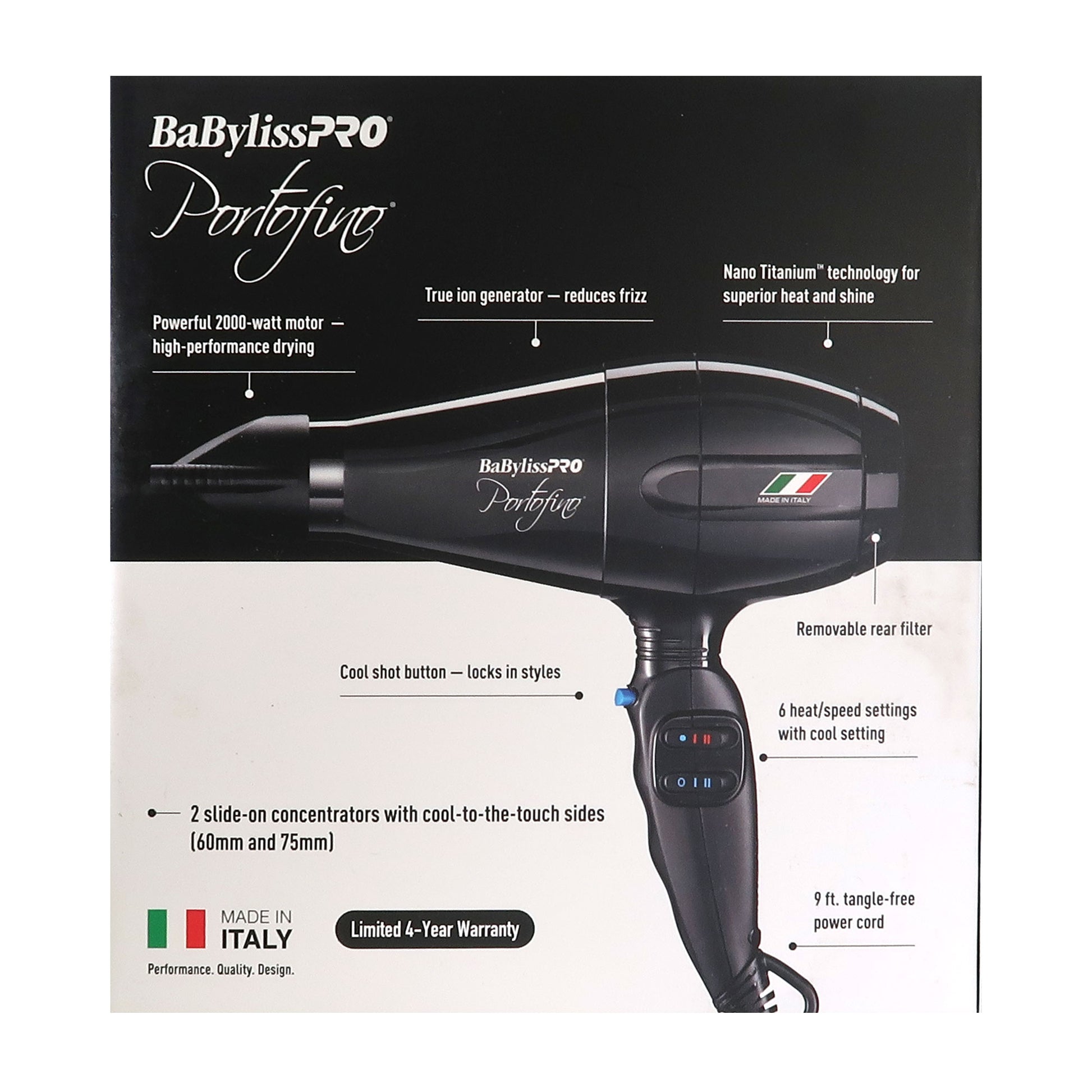 Equipped with a high-performance 2000-watt Italian motor, the Portofino 6600 is enhanced with Nano Titanium technology to distribute heat evenly for optimal results. The negative ions generated by the dryer will remove any static electricity in the hair and close the cuticle for smooth, shiny results.