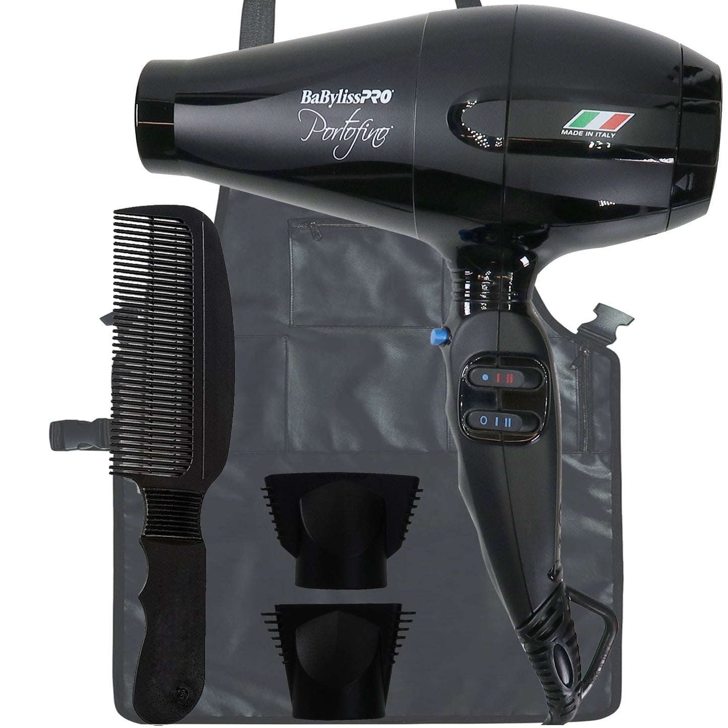 BABYLISS PRO PORTOFINO 2000 WATTS DRYER BLACK BP0R1 + WAHL FLAT TOP COMB 3329 + BARBEROLOGY INDUSTRIAL BARBER APRON