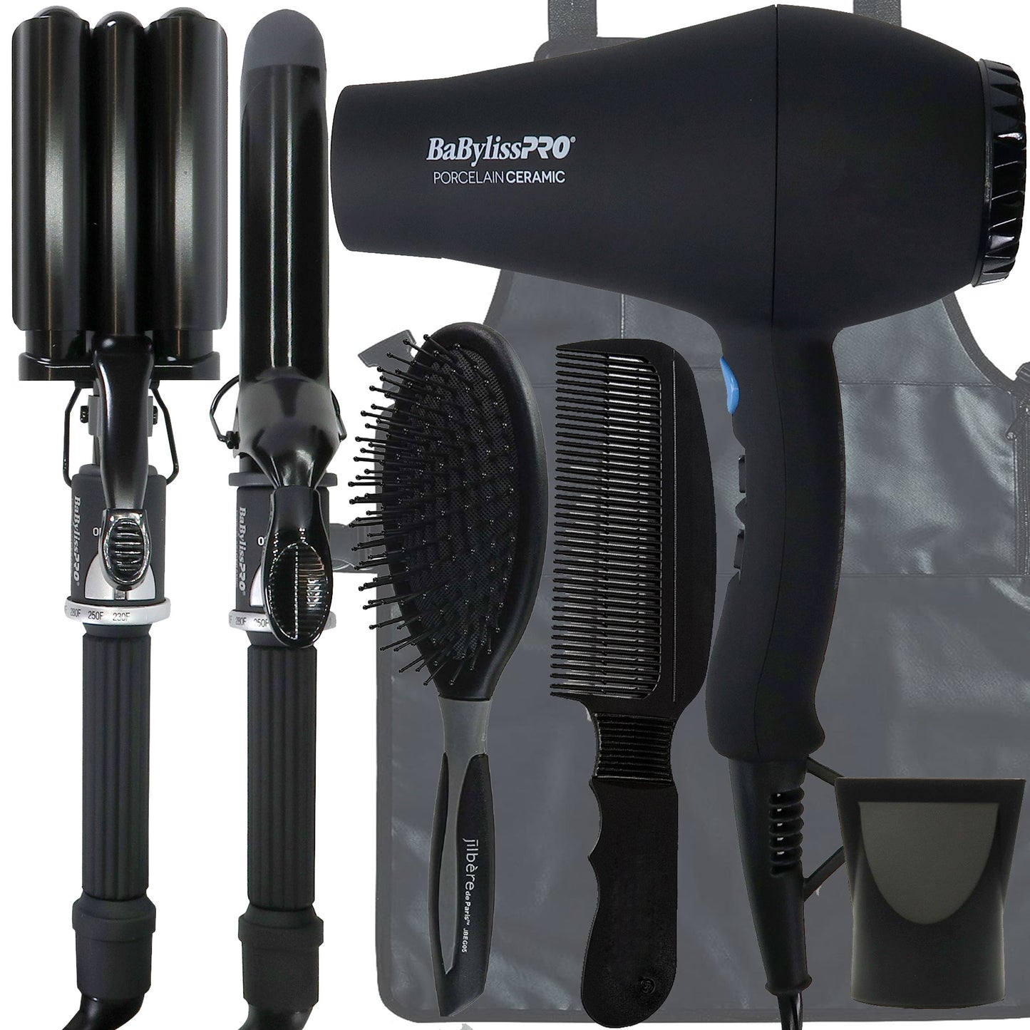 BABYLISS PRO PORCELAIN CERAMIC GIFT BOX (DRYER, WAVER, CURLING IRON) + ERGO GRIP DETANGLER BRUSH + FLAT TOP COMB + INDUSTRIAL BARBER APRON