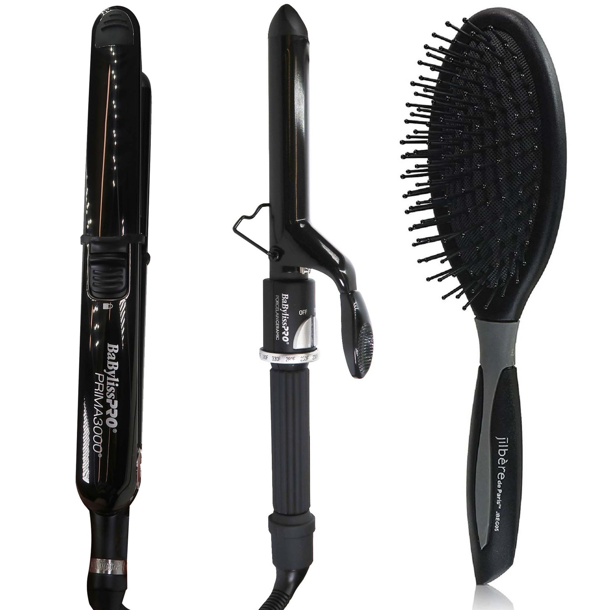 BABYLISS PRO LIMITED EDITION NANO TITANIUM PRIMA 3000 STAINLESS STEEL FLAT IRON BLACK 1¼" BNTBK3000TUC + BABYLISSPRO PORCELAIN CERAMIC 1" SPRING CURLING IRON + CONAIR PRO ERGO-GRIP DETANGLER BRUSH FOR ALL HAIR TYPES
