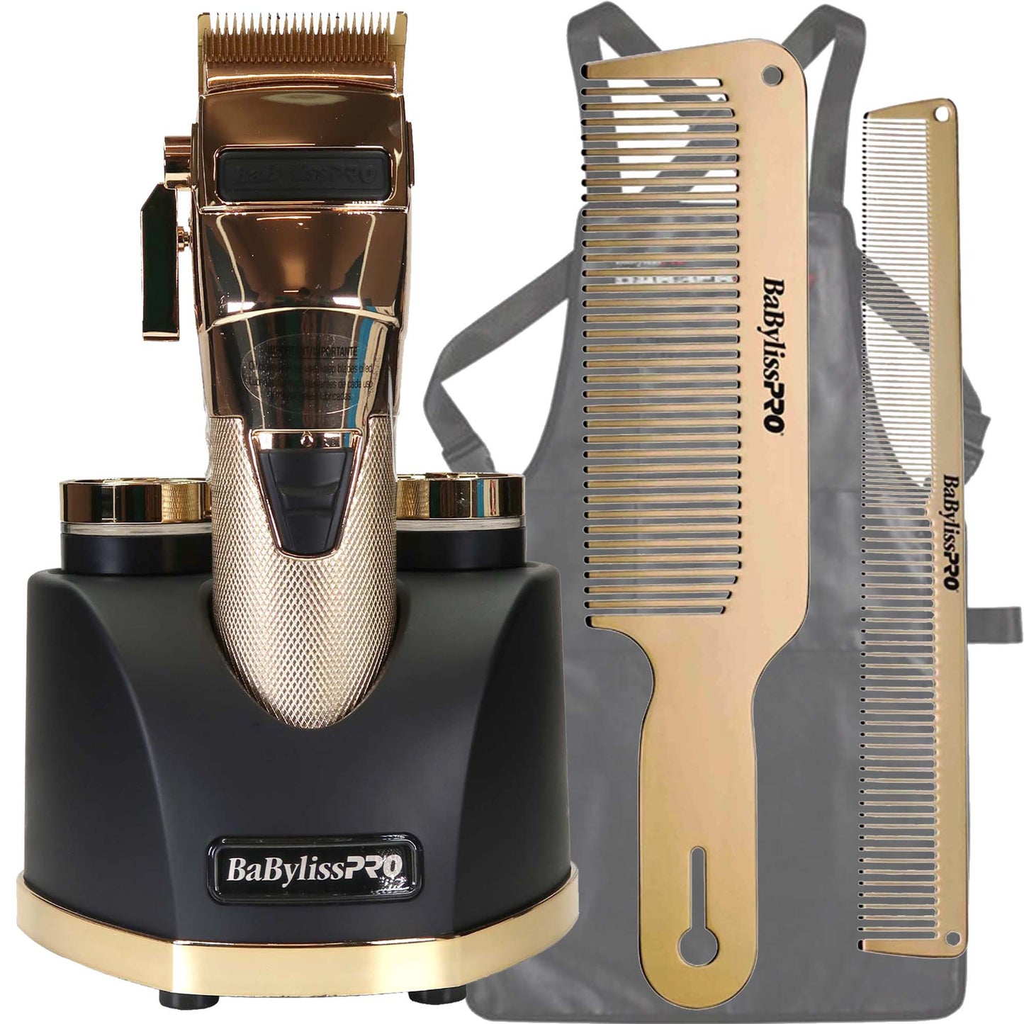 BAYLISS PRO LIMITED EDITION SNAP FX CORDLESS CLIPPER WITH SNAP IN/OUT DUAL LITHIUM BATTERY w/ BASE #FX890GI + BABYLISS PRO BARBEROLOGY INDUSTRIAL BARBER APRON + BABYLISS PRO BARBEROLOGY GOLDFX METAL COMB SET 9" CLIPPER COMB AND 7.5" CUTTING COMB GOLD