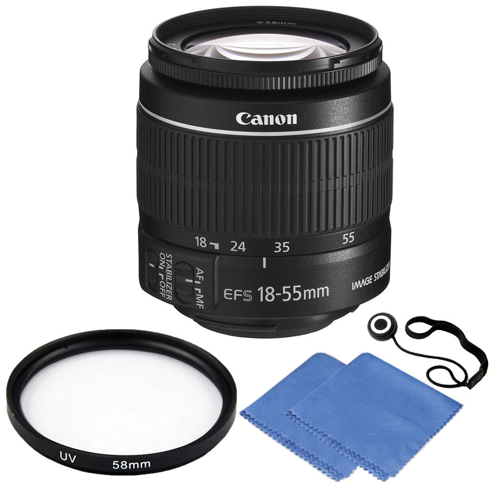 The EF-S 18-55mm f/3.5-5.6 IS II Lens is a standard zoom lens that features the smaller size image circle, exclusively designed for Canon cameras using the APS-C size sensor. The focal length is equivalent to 29-88mm in the 35mm format. It is a versatile lens for everyday shooting and can focus as close as 9.8". With 58mm UV Filter + Cleaning Cloth + Lens Cap Holder