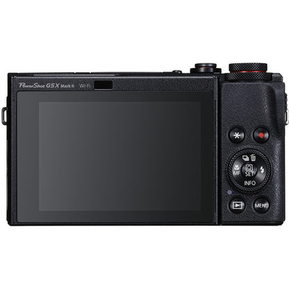 Packing apt imaging capabilities within a svelte-yet-versatile design, the Canon PowerShot G5 X Mark II is an advanced compact camera featuring a large sensor, fast processing, and a flexible zoom lens. The 20.1MP 1" CMOS sensor uses a stacked design, which couples with the DIGIC 8 image processor to realize fast autofocus performance, quick full resolution shooting up to 20 fps, and UHD 4K30p video recording. Complementing the sensor and processor is a 5x zoom lens, which covers a 24-120mm equivalent focal length range for wide-angle to short-telephoto fields of view. An f/1.8-2.8 maximum aperture range suits working in difficult lighting conditions as does an Optical Image Stabilizer, which compensates for the effects of camera shake. Rounding out the G5 X Mark II's design, the camera features a pop-up 2.36m-dot electronic viewfinder, 180° tilting touchscreen LCD, and has both Bluetooth and Wi-Fi for wirelessly connecting to a mobile device.