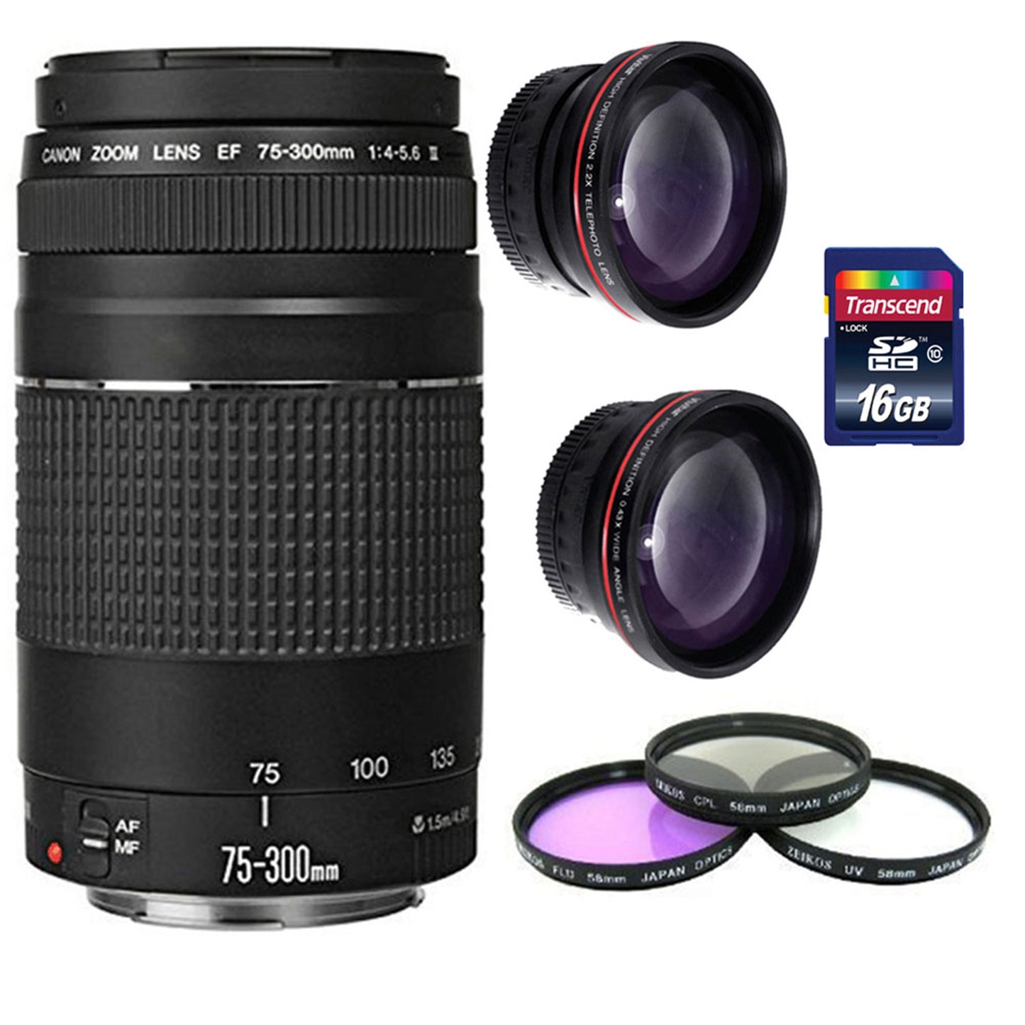 Canon 75-300mm Lens The EF 75-300mm f/4-5.6 III Lens from Canon is a telephoto zoom lens ideal for day-to-day use because it is particularly light and compact, especially given its long focal reach. Able to magnify distant subjects, it also compresses the space between subjects within the frame and with a shallow depth of field at its longer lengths, it offers attractive out of focus bokeh. Its minimum focus distance is 4.9', even at the telephoto end of its zoom. 58mm Telephoto Lens The Telephoto Lens Attachment for 58mm Filter Thread is a telephoto lens attachment for cameras with 58mm filter threads. It offers a much narrower angle of view than the camera's lens capability 58mm Wide Angle Lens The 0.43x 58mm Wide Angle Lens is a wide angle lens attachment for cameras with 58mm filter threads. It offers a much wider angle of view than the camera's lens capability. 58mm Filter Kit These filters are manufactured from high quality solid optics. Each individual filter is heat treated and coated to avoid any rare movement or distortion. UV Protective Filter removes or absorbs ultra violet rays, giving sharper contrast to your film or video. Protects your lens from scratches or fingerprints. CPL circular polarizer filter increases color sturations, darker blue skies, so white clouds stand out and eleminate reflections from non metallic surfaces like glass or water. Florescent filter allows for using your camera under florescent lighting giving you natural light colors when shooting under florecent conditions. 16GB Memory Card More memory means more pictures, and you'll be able to store hundreds of high-quality photos and videos with this ultra-fast Transcend 16GB SecureDigital (SDHC) 300x UHS-1 Class 10 Memory Card. SDHC features high data transfer speeds, allowing you to capture images and video faster than with a standard SD card.Now you can shoot faster, capture super-smooth digital video, and take full advantage of your camera's maximum image quality and resolution settings. UHS-1 Cards are fully compatible with SD 3.01 standards, easy to use with plug-and-play operation and feature built-in Error Correcting Code (ECC) to detect and correct transfer errors.