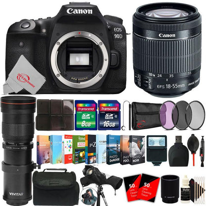 Situated as a versatile camera with capable photo and video traits, the Canon EOS 90D is a sleek DSLR also characterized by its high-resolution 32.5MP APS-C CMOS sensor. This updated sensor design achieves enhanced image clarity, resolution, and dynamic range, along with adept sensitivity to ISO 25600 and low noise to suit working in a variety of situations. Combined with advanced image processing, this sensor is also capable of outputting UHD 4K30p and Full HD 120p video, as well as supporting continuoUSstills shooting rates up to 10 fps. When working with the optical viewfinder, an apt 45-point all cross-type AF system affords fast performance in a range of lighting conditions for tracking moving subjects and working in low light, while the 5481-point Dual Pixel CMOS AF system benefits live-view shooting and movie recording by providing a smooth, natural focusing quality akin to the way a camcorder acquires focus. Complementing the imaging capabilities, the 90D sports a vari-angle touchscreen LCD for intuitive control and compositional freedom, and an optical pentaprism viewfinder provides a bright, clear, and realistic viewing means characteristic of the DSLR shooting experience. Additionally, built-in Wi-Fi and Bluetooth connectivity allow you to pair mobile devices with the camera to wirelessly transfer files for sharing your photos and movies online.