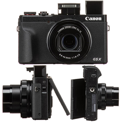Packing apt imaging capabilities within a svelte-yet-versatile design, the Canon PowerShot G5 X Mark II is an advanced compact camera featuring a large sensor, fast processing, and a flexible zoom lens. The 20.1MP 1" CMOS sensor uses a stacked design, which couples with the DIGIC 8 image processor to realize fast autofocus performance, quick full resolution shooting up to 20 fps, and UHD 4K30p video recording. Complementing the sensor and processor is a 5x zoom lens, which covers a 24-120mm equivalent focal length range for wide-angle to short-telephoto fields of view. An f/1.8-2.8 maximum aperture range suits working in difficult lighting conditions as does an Optical Image Stabilizer, which compensates for the effects of camera shake. Rounding out the G5 X Mark II's design, the camera features a pop-up 2.36m-dot electronic viewfinder, 180° tilting touchscreen LCD, and has both Bluetooth and Wi-Fi for wirelessly connecting to a mobile device.