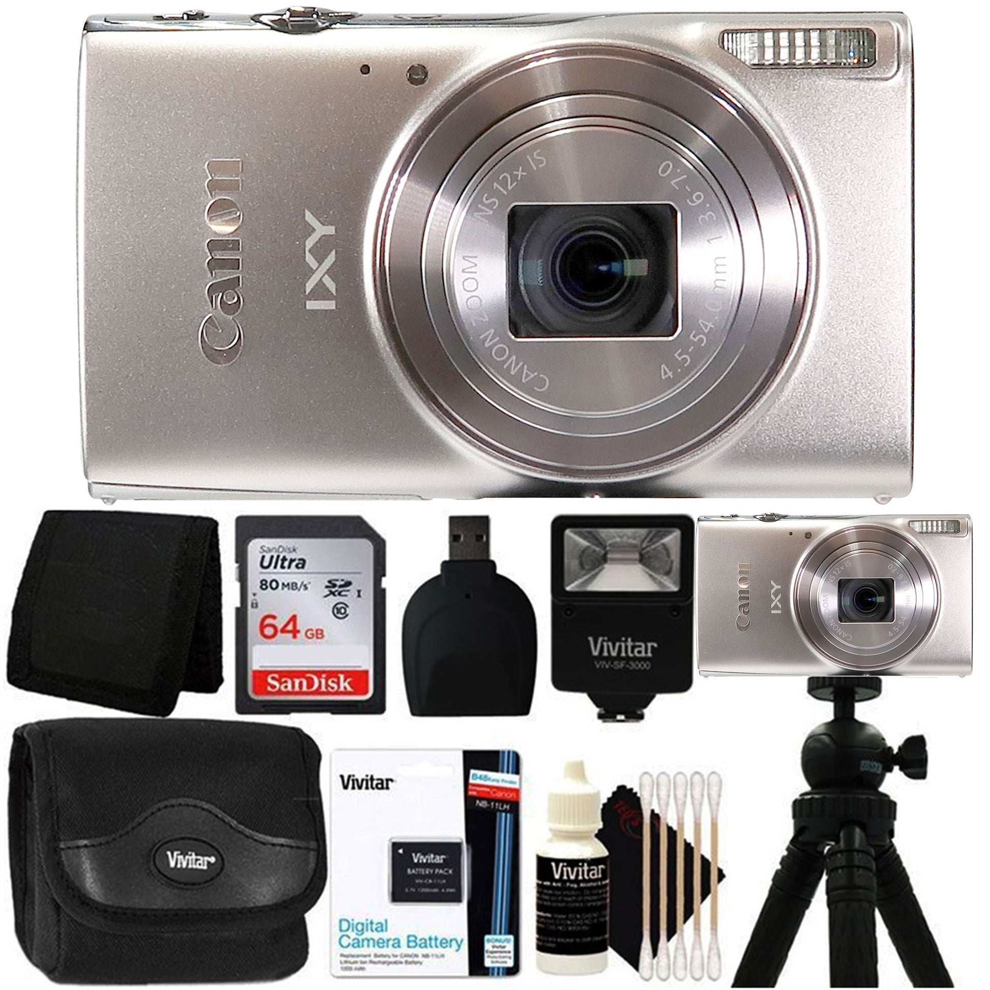 CANON POWERSHOT IXY 650 / ELPH 360 20.2MP POINT AND SHOOT DIGITAL CAMERA (SILVER) + 64GB MEMORY CARD + MEMORY CARD WALLET + CARD READER + SLAVE FLASH + EXTRA BATTERY + CAMERA CASE + 42" FOLDABLE TRAVEL TRIPOD + CLEANING KIT