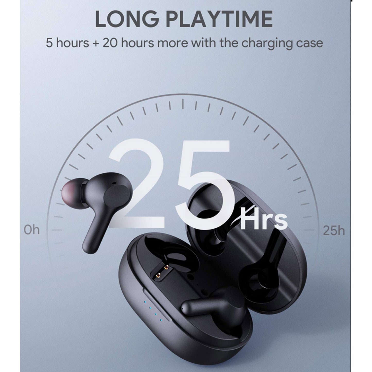 - 25-Hour Playtime - The earbuds stream Hi-Fi stereo sound for up to 5 hours on a single charge. There’s an extra 20 hours in the compact charging case that is quickly recharged with USB-C.