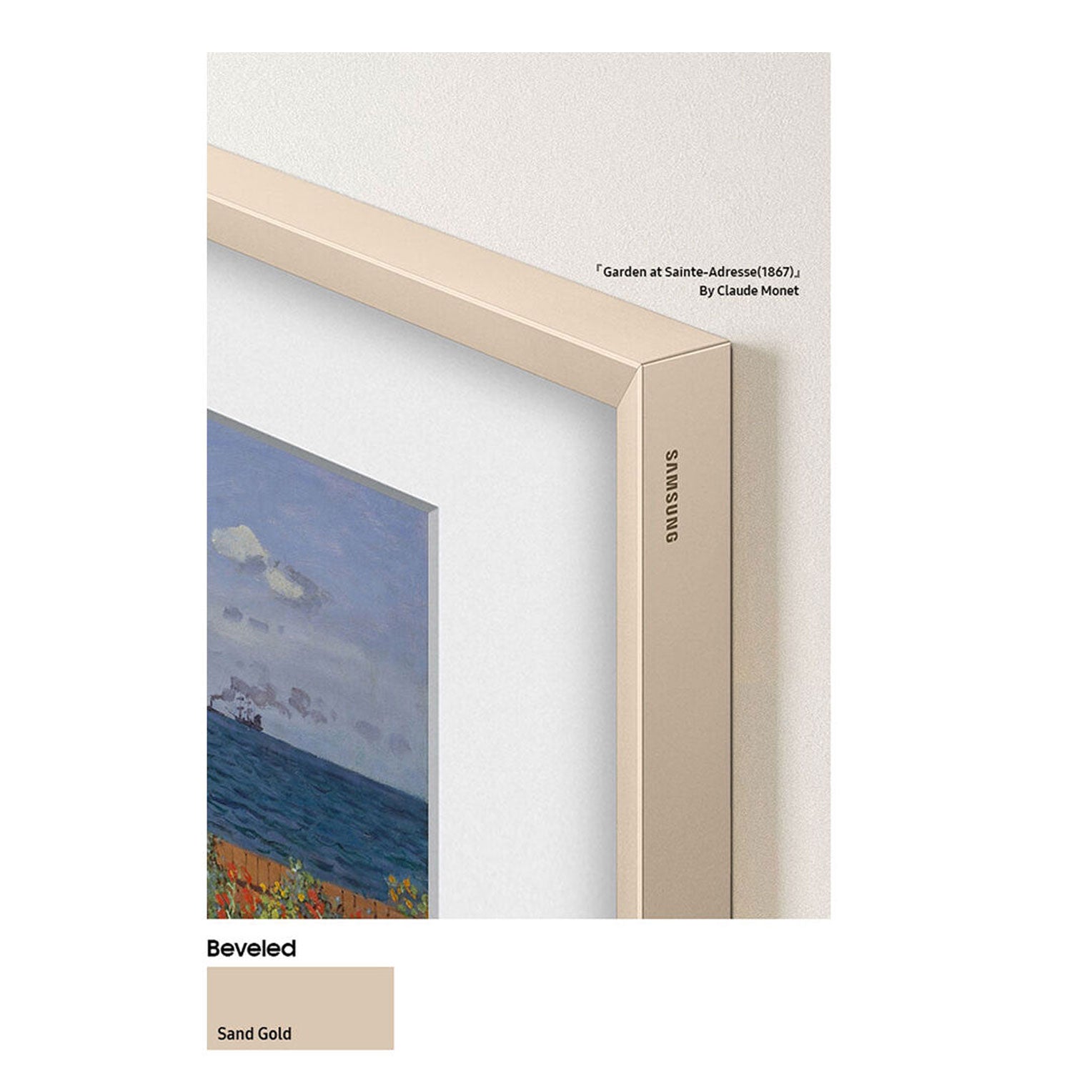 Match the look of your The Frame display to your decor with the Magnetic Metal Bezel for 32" LS03C The Frame TV from Samsung. This accessory is designed to cover the existing bezel to change its colorjust like a regular picture frame. This sand gold-colored frame is made to easily attach to your 32" LS03C The Frame TV with magnets, covering the existing bezel. At only 0.1" thick, your The Frame TV bezel will still blend with your space, letting you and your guests focus on what is being displayed.