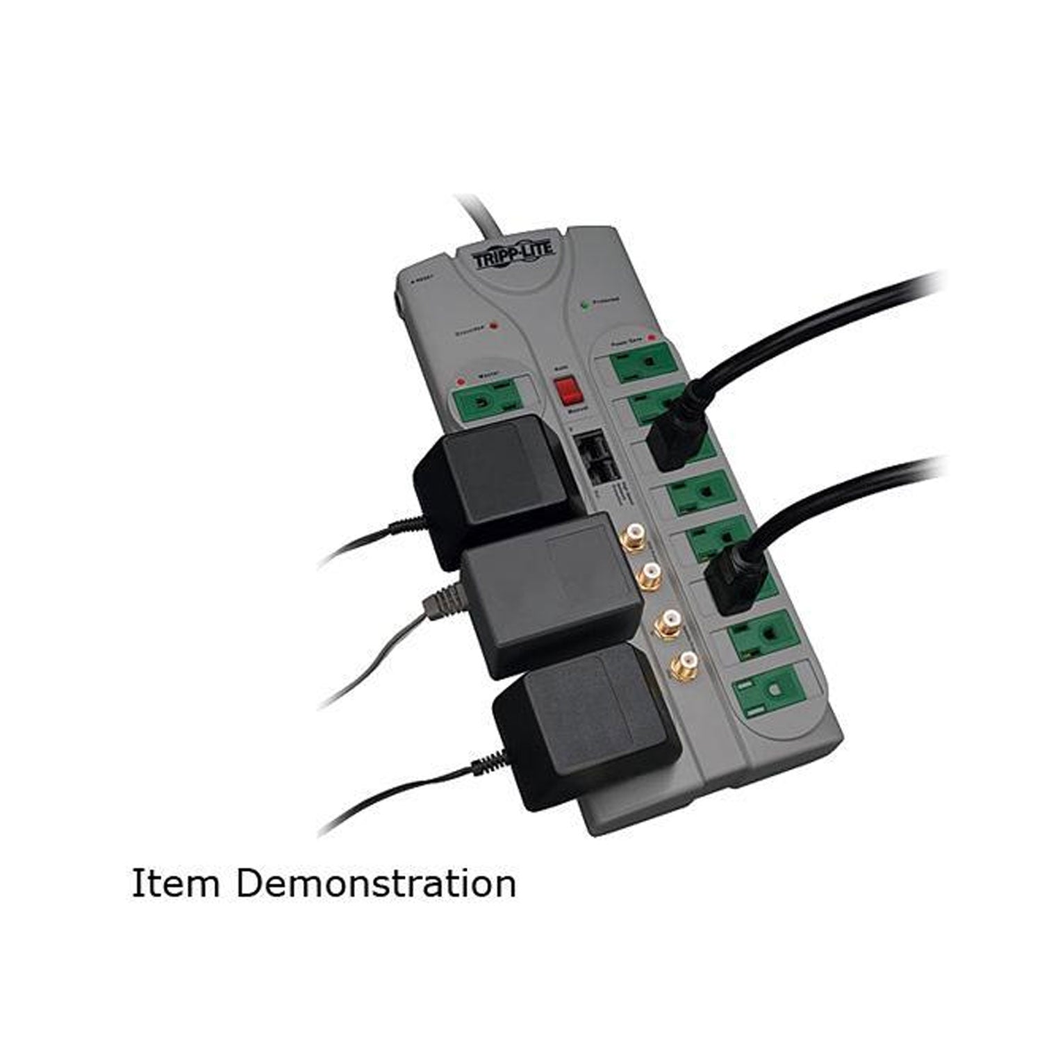 Each power adapter and glowing LED in your home or office represents a potential ""phantom load""—power wasted by a device when it isn't being used, even when it appears to be turned off. ECO-Surge eliminates phantom loads by automatically turning off special energy-saving outlets when you turn off the device connected to the ""Master"" outlet. The energy-saving outlets disconnect phantom loads from any source of electricity, making it impossible for them to waste energy. Other outlets stay on to support devices that operate 24/7, such as DVRs. ECO-Surge detects when you turn off the device connected to the ""Master"" outlet—typically a computer or television—then turns off the ""Power Save"" outlets. Turning off the ""Power Save"" outlets prevents any phantom loads connected to those outlets from wasting electricity. The ""Always On"" outlets remain powered to support devices like DVRs, cable/satellite boxes, broadband modems and wireless routers. When you turn on the ""Master"" device, the ""Power Save"" outlets also turn on and your entire system is ready to use. The ECO-Surge wattage switch ensures reliable operation whether you're using a higher-wattage ""Master"" device (such as a television, desktop computer or full-size laptop) or a lower-wattage ""Master"" device (such as a netbook). Simply flip the switch to match your device. The TLP1210SATG offers advanced surge protection and performance enhancement for PCs, peripheral devices A/V components and all electronics. Its 3600-joule surge suppression rating prevents even the strongest surges from damaging your valuable electronics. The TLP1210SATG provides a total of 12 NEMA 5-15R outlets with built-in safety covers, arranged to accommodate up to four bulky transformers without blocking remaining outlets. The TLP1210SATG also features a 10-ft. power cord, enabling connection to a distant wall outlet, and a space-saving, right-angle plug that allows furniture to be placed flush against the wall. Various electrical and radio sources can cause disruptive interference on the AC line. This line noise is a common cause of incremental hardware damage, data corruption and audio/video performance problems. The TLP1210SATG provides full EMI/RFI filtering to eliminate line noise interference and ensure peak component performance. In addition to AC line protection, the TLP1210SATG includes a set of RJ45 jacks to prevent surge damage on phone or network connections (6-ft. network cable included), and two sets of gold Type F coax jacks to prevent surges from damaging your cable/satellite equipment (6-ft. coax cable included). The TLP1210SATG features six diagnostic LEDs. Two confirm safe grounding and active surge protection, and four indicate that AC power is available at the outlets. An illuminated master switch provides one-touch power control over all components. The TLP1210SATG is manufactured in compliance with strict RoHS specifications, reflecting Tripp Lite's commitment to environmental responsibility.