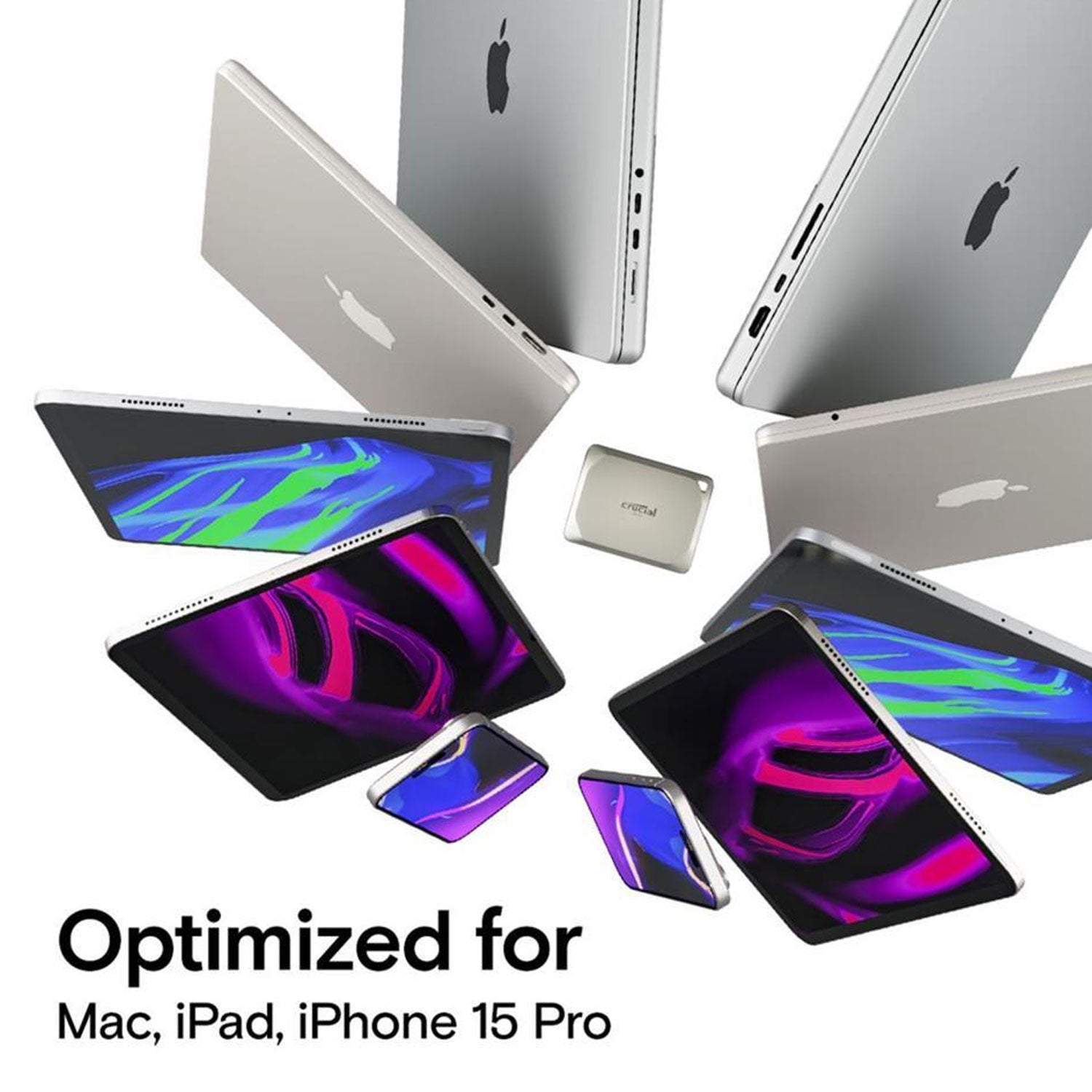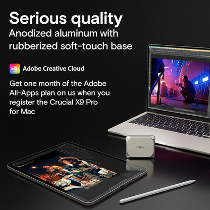 Designed for Mac and optimized to work with Apple devices right out of the box, the Crucial X9 Pro for Mac helps you supercharge your creativity. With space to store thousands of photos, files, and videos and the speed to edit and retouch your media quickly, the Crucial X9 Pro for Mac gives you the capacity to tackle even taxing workloads along with durability and style in the studio, in the field, or wherever you roam. The X9 Pro for Mac is optimized for modern Apple devices like Mac, iPad and iPhone 15 Pro/Pro Max and offers out-of-the-box plug-and-play compatibility without the need to reformat for Time Machine backups. With IP55 water and dust resistance and drop-proof durability up to 7.5 feet/2 meters, your X9 Pro for Mac is durable enough to travel anywhere you shoot, work or roam. Innovated by Micron, the Crucial X9 Pro for Mac is sleek and light with anodized aluminum and a rubberized soft-touch base in a mini 65 x 50 mm design that includes a drive activity light in the integrated lanyard hole.