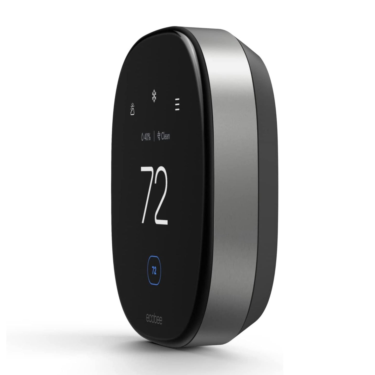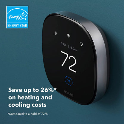 Save up to 26 Percent per year on heating and cooling costs. ENERGY STAR certified. Included SmartSensor adjusts the temperature in the rooms that matter most to reduce hot or cold spots to keep you comfortable. Compared to a hold of 72 Degrees Fahrenheit/22 Degrees Celsius. Built-in air quality monitor alerts you to poor air quality, provides tips on how to improve it, and reminds you when it's time to change your furnace's air filter. Premium materials and advanced engineering mean a large, vibrant display with a cinematic interface, a timeless design, and next level occupancy sensing. ecobee Smart Thermostat Premium is a complete home monitoring hub that includes built-in smoke alarm detection and alerts to possible break-ins when your system is armed. Get notifications during sudden temperature drops that could cause damage. ecobee Smart Security plan required Designed with the planet in mind, ecobee Smart Thermostat Premium conserves energy use so you can reduce your home's carbon footprint by simply using your thermostat. From packaging to materials, every part of the thermostat creates less waste and uses less resources. Comes with a smart speaker and your choice of Siri or Alexa Built in. Control your home using the power of your voice and listen to your favorite Spotify playlists and podcast through your thermostat's speaker. Apple home hub required to enable Siri on Smart Thermostat Premium.