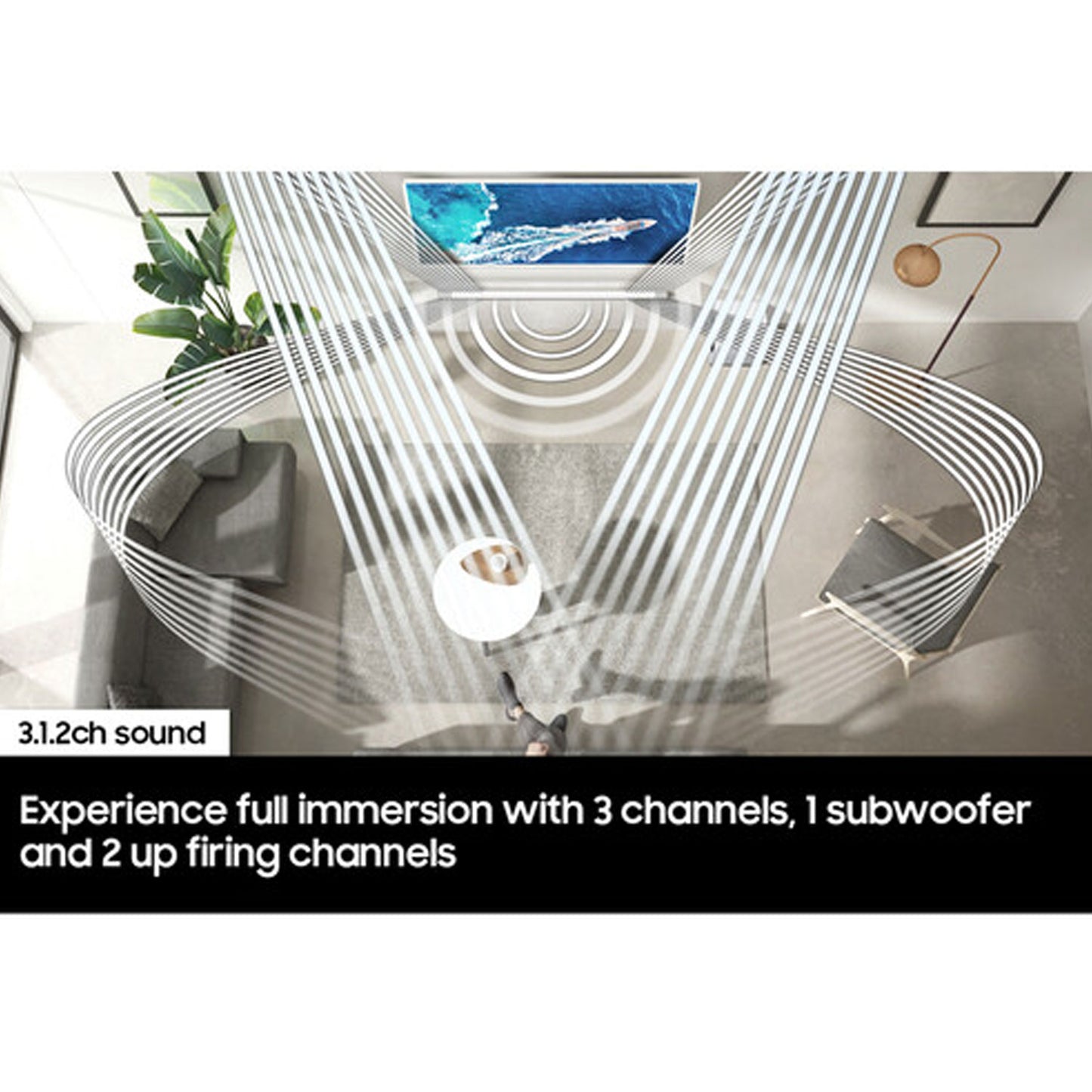- TRUE 3.1.2CH SOUND: Enjoy a cinematic audio experience, with 3 channels, 1 subwoofer and 2 up-firing channels combined to put you at the center of the action.
