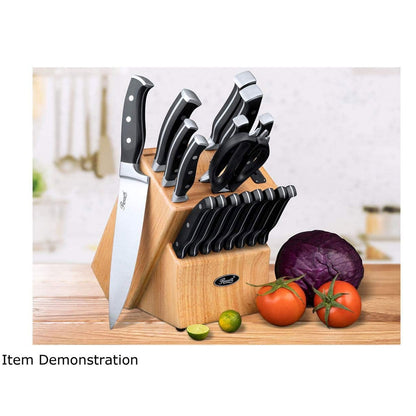 Premium stainless-steel cutlery set with 16 knives, a pair of kitchen shears, and a wood block. This set provides you with the proper kitchen tools to prepare any meal. Whether you're cutting, dicing, mincing, slicing, or even peeling, you'll always have the right tool for the job. The included wooden block provides safe storage to improve the lifespan of your knives and the built-in blade sharpener ensures your knives continue cutting effectively.