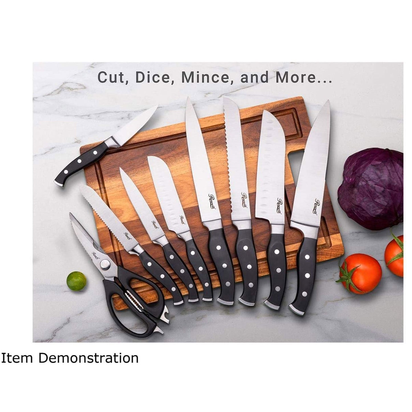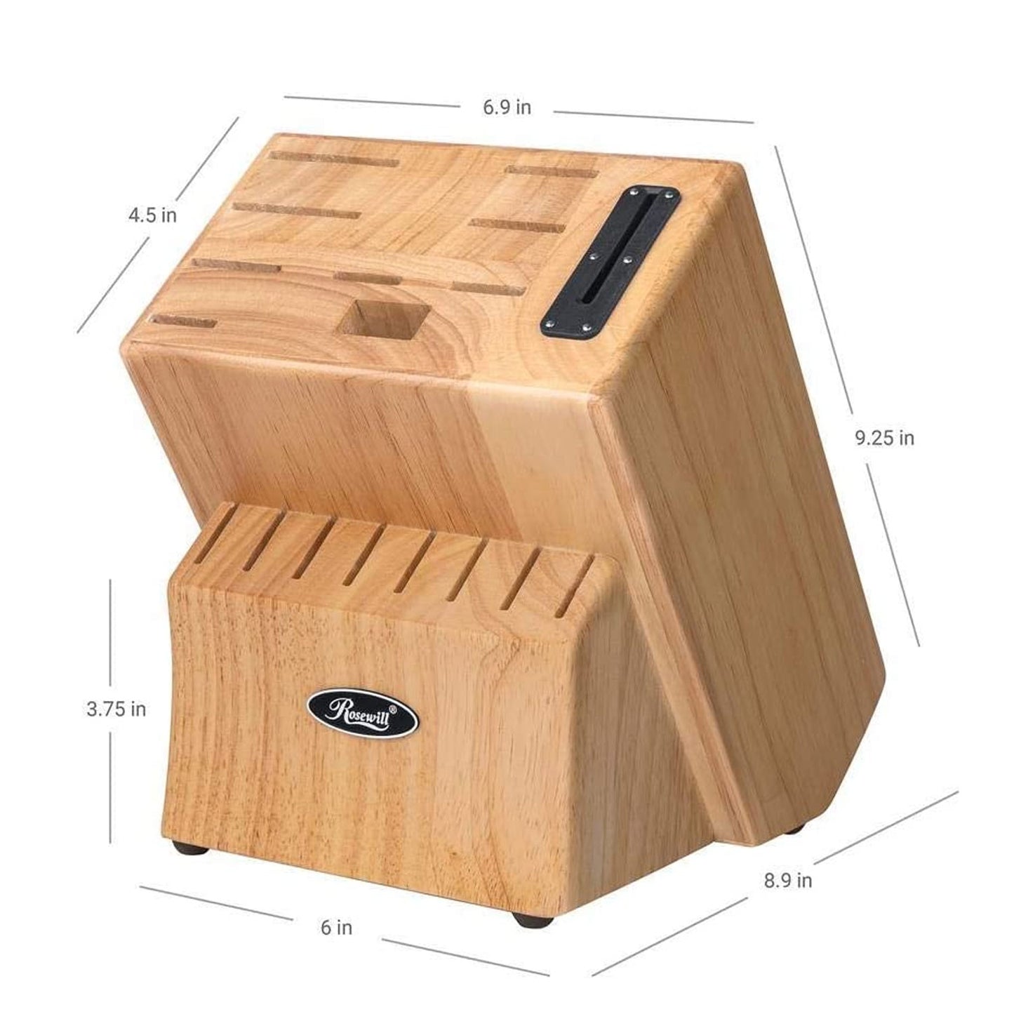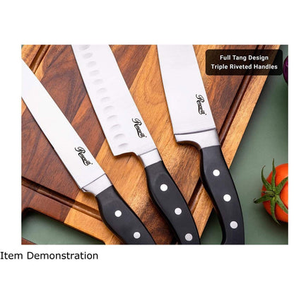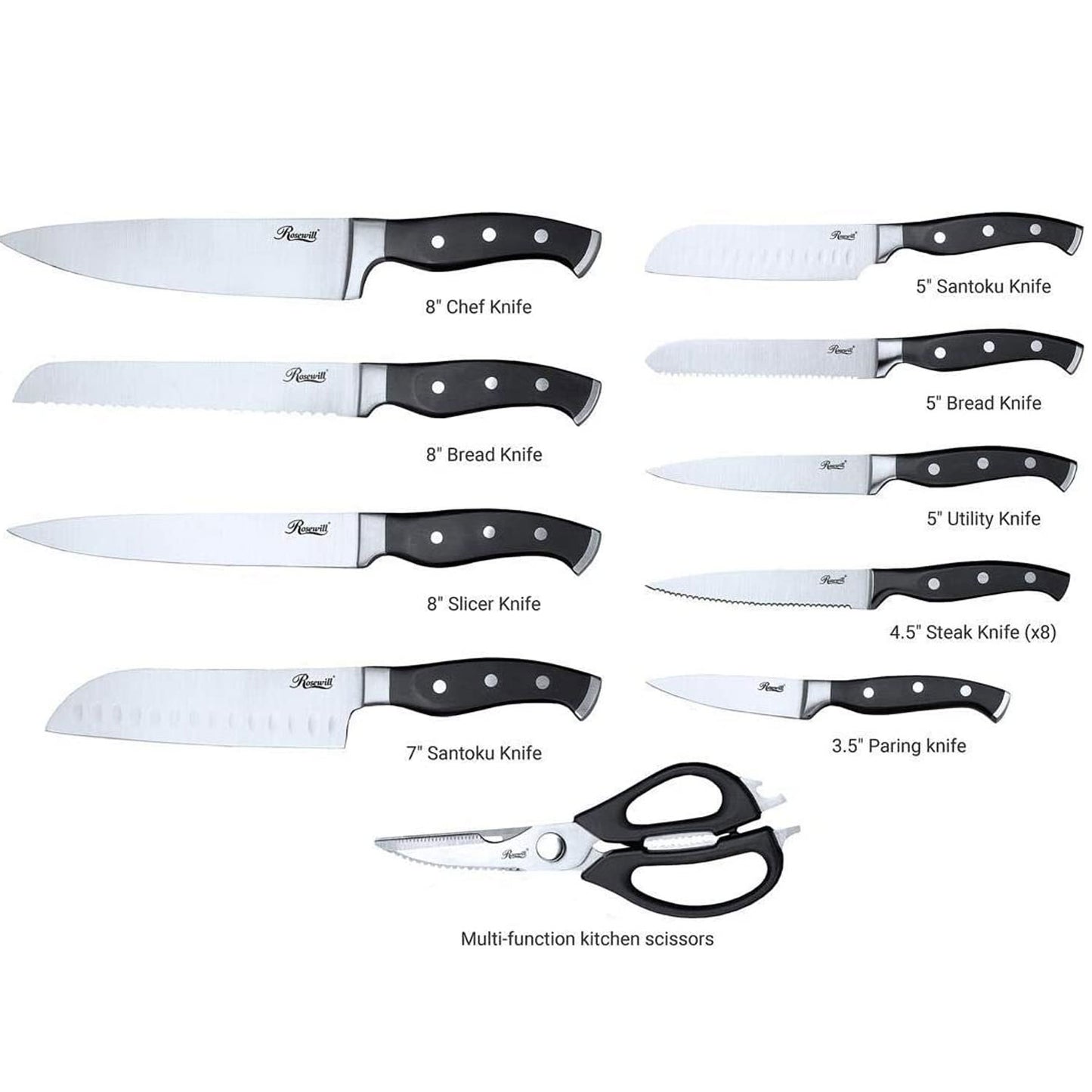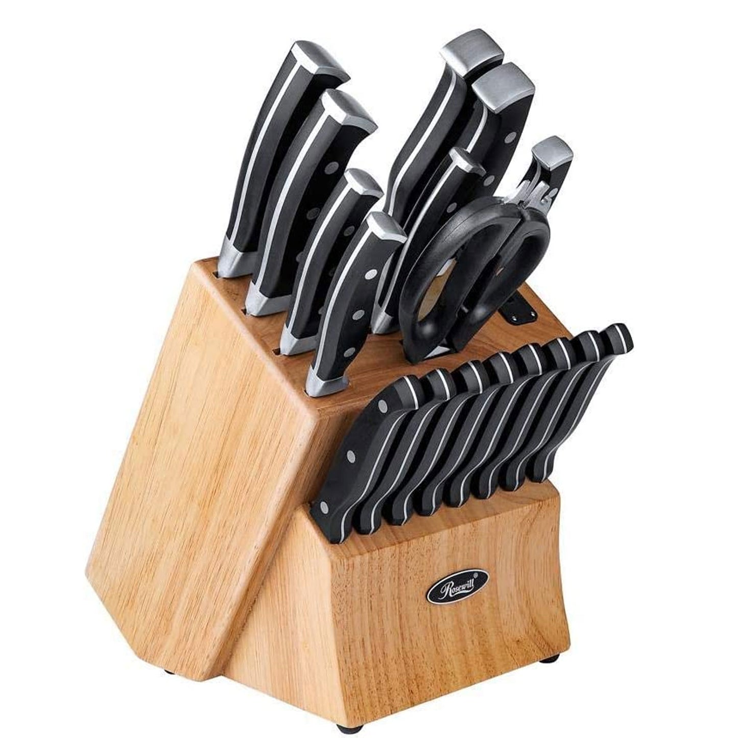 ROSEWILL 18-PIECE STAINLESS STEEL PROFFESIONAL CUTLERY KITCHEN KNIFE SET WITH SHEARS, TRIPLE RIVETED HANDLES, FULL TANG DESIGN, WOOD BLOCK, BUILT-IN SHARPENER (RHKS-20001)