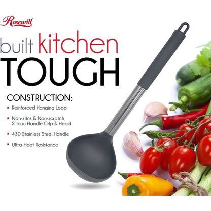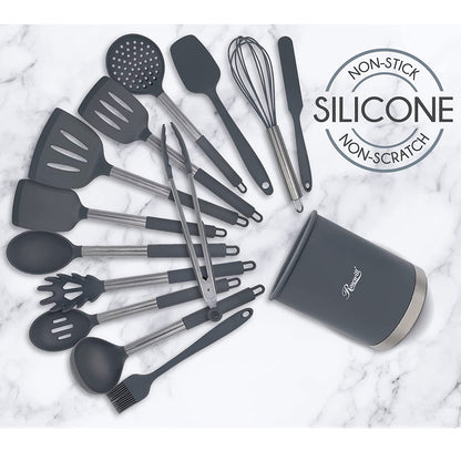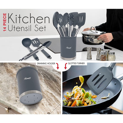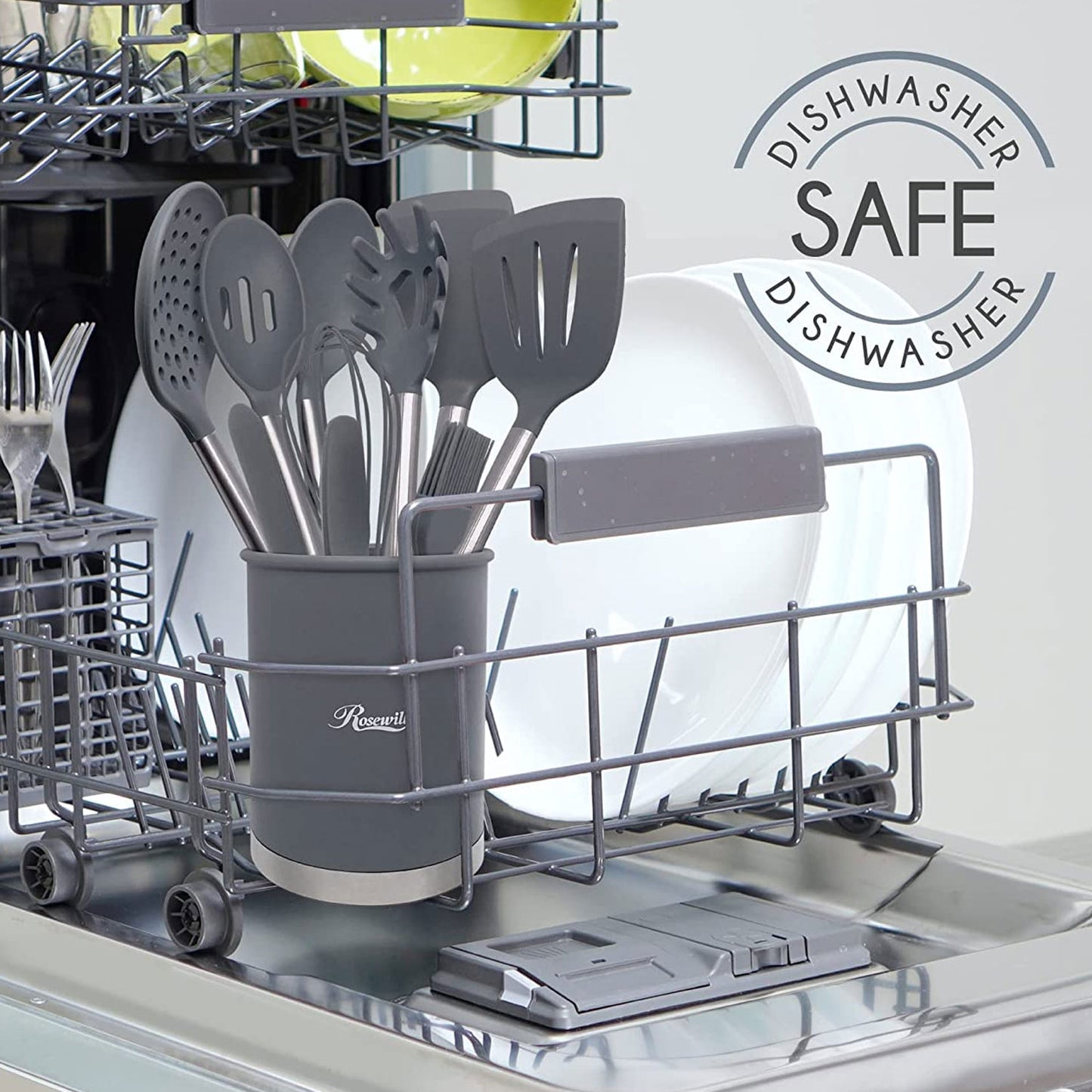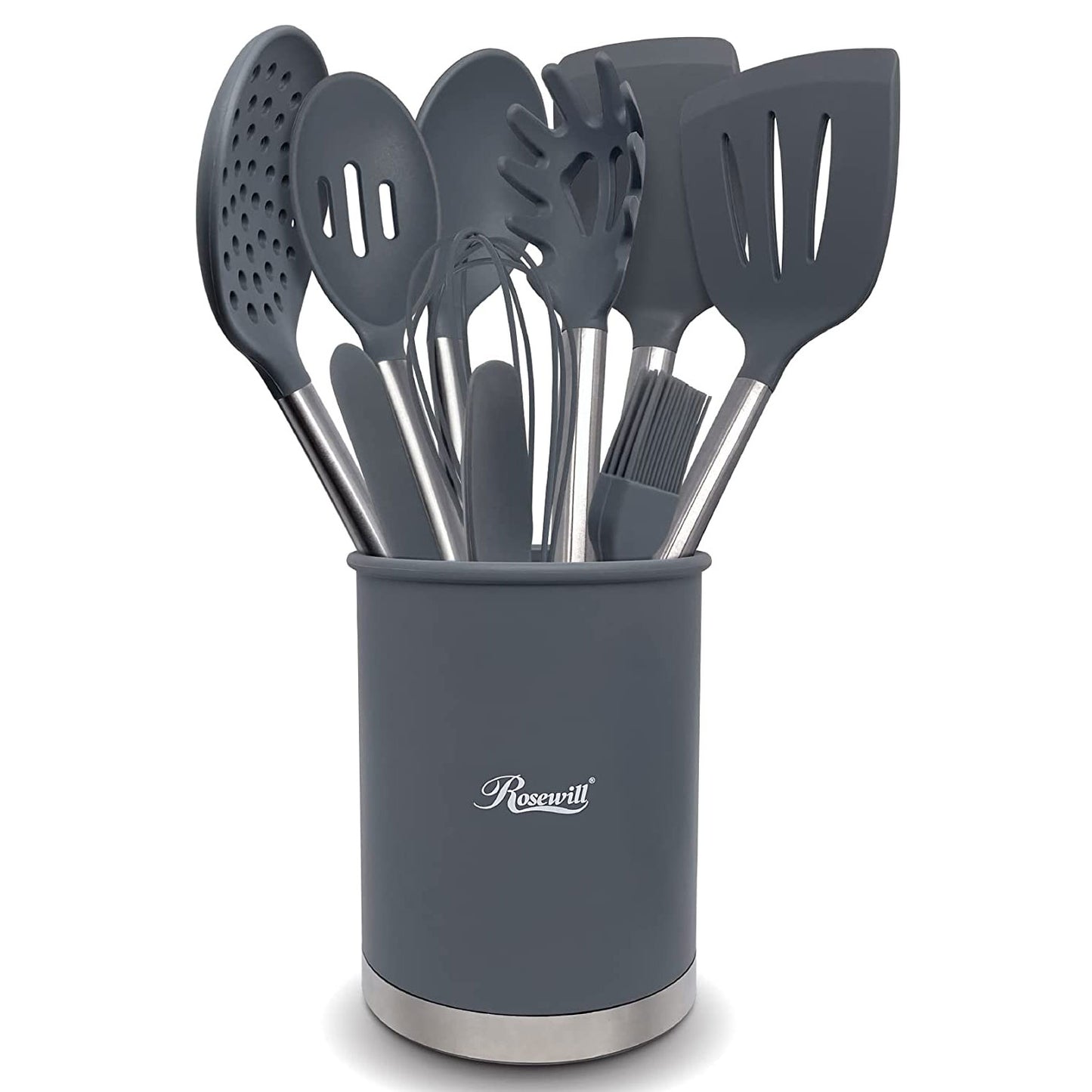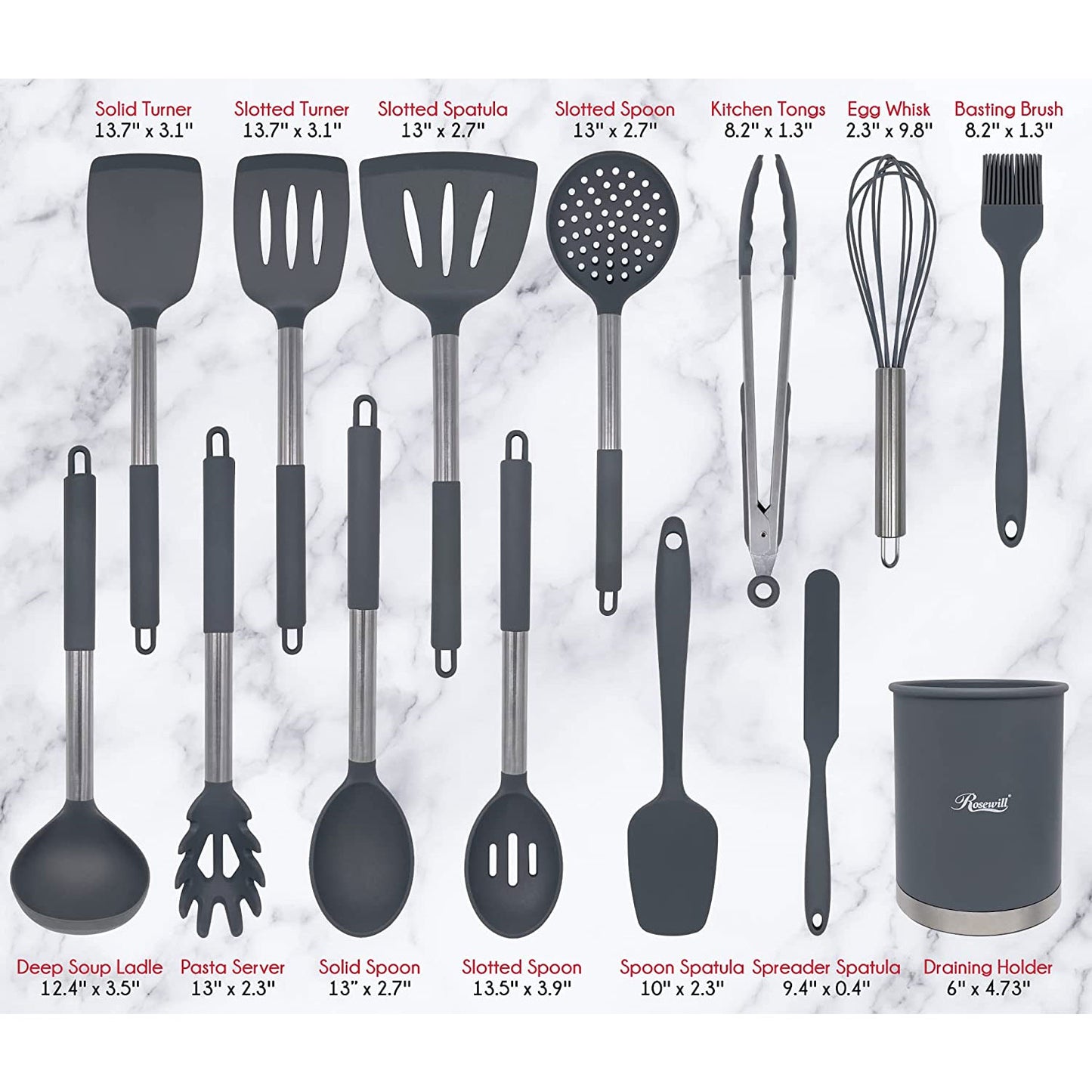 ROSEWILL KITCHEN SILICONE COOKING UTENSIL SET | HIGH HEAT RESISTANT SPATULAS, SPOONS, LADLE, TONGS WITH STAINLESS STEEL HANDLE, DRAINING HOLDER | 14-PIECE, FOOD GRADE, DISHWASHER SAFE (RHKU-21001)